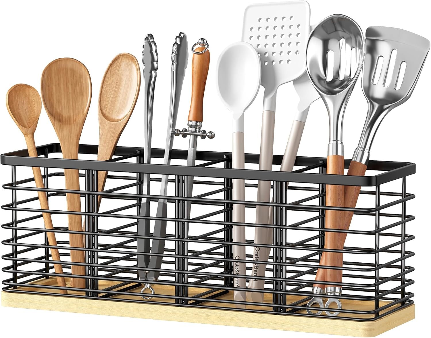 Extra Large Kitchen Utensil Holder, Metal Utensil Organizer with 4 Compartments, Black Cooking Utensil Holder for Kitchen Counter with Wooden Base