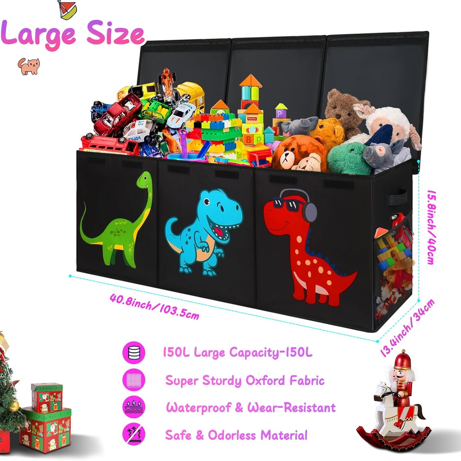 Extra Large Toy Box: Our toy chest storage measures 41″x14″x16″ and has a capacity of over 150L, which is large enough to hold a large number of stuffed animals, groceries, clothes, books and almost all plushies toys, making the home tidy and clean