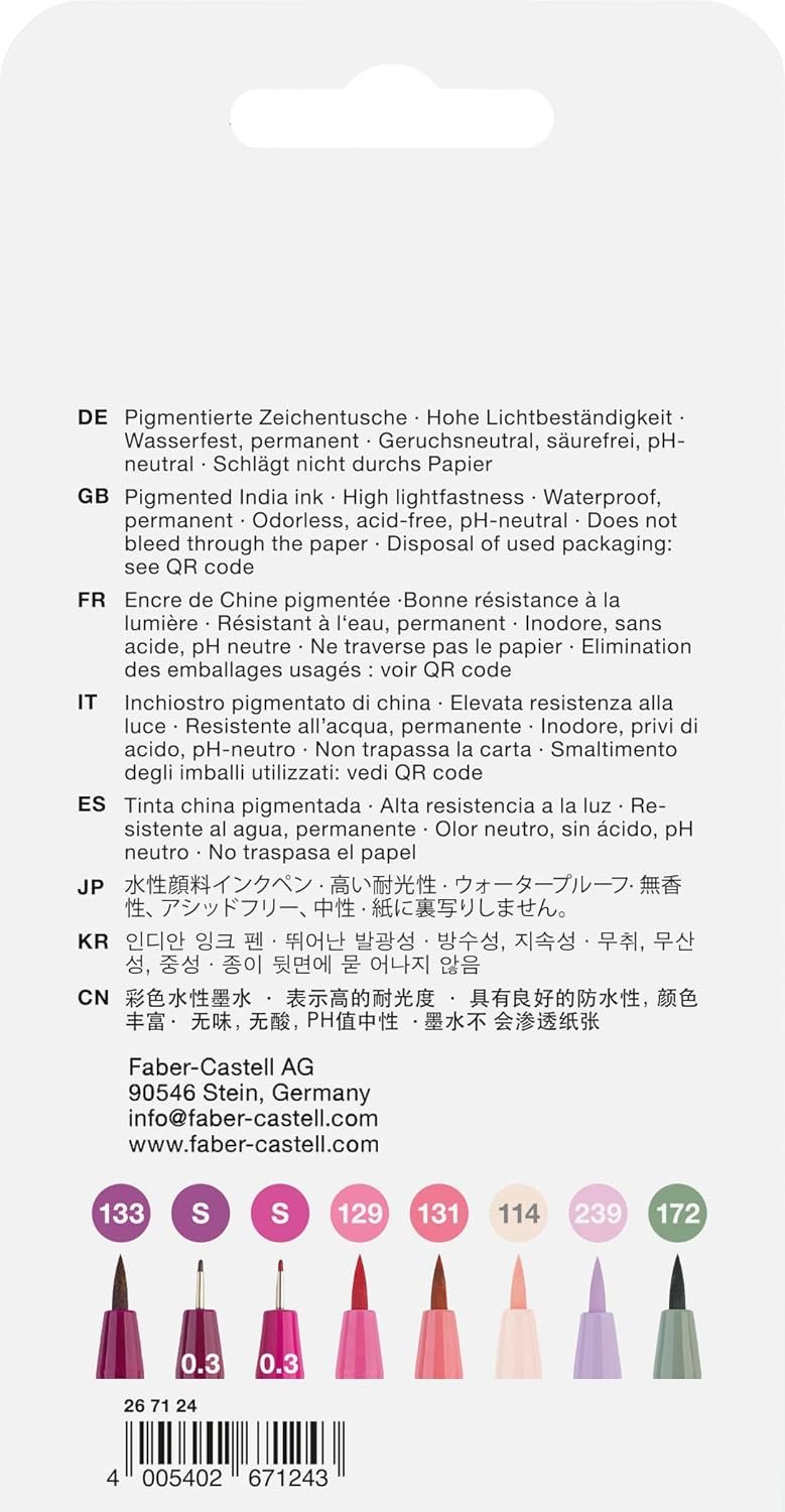 Explore the art of modern calligraphy and hand lettering designs with color curated brush pen sets form Faber-Castell. Developed with professional hand lettering artists, This set is ideal for creative lettering and letter art! Learn the basics of lettering and modern calligraphy art with this color Starter set by Faber-Castell! This hand lettering color assortment features a variety of shades of pinks and reds, perfect for floral illustrations and letterings. Add a pop of color to your modern calligraphy designs with Faber-Castell Pitt Artist Pens. See your artwork come to life with the very best quality materials! Faber-Castell Pitt pens feature High quality, water based India ink Ink that is highly pigmented, lightfast (resistant to fading), water and smudge resistant, permanent, odor free, acid-free and ph neutral. Includes 8 Pitt Artist Pens in Pink and Red tones. Colors and nibs included: brush (light Skin, Middle Purple Pink, Pink Madder Lake, medium flesh, Magenta, earth green and lilac) and 1 Superfine Magenta (for adding detail). Faber-Castell Pitt Artist Pens are multi-purpose and work on a variety of surfaces! Premium India ink will not bleed through your pages and the colors can be layered on a variety of paper types, canvas, books, journals or a variety of artwork and sketches. For best results, store your Pitt Artist Pens horizontally for even ink distribution.