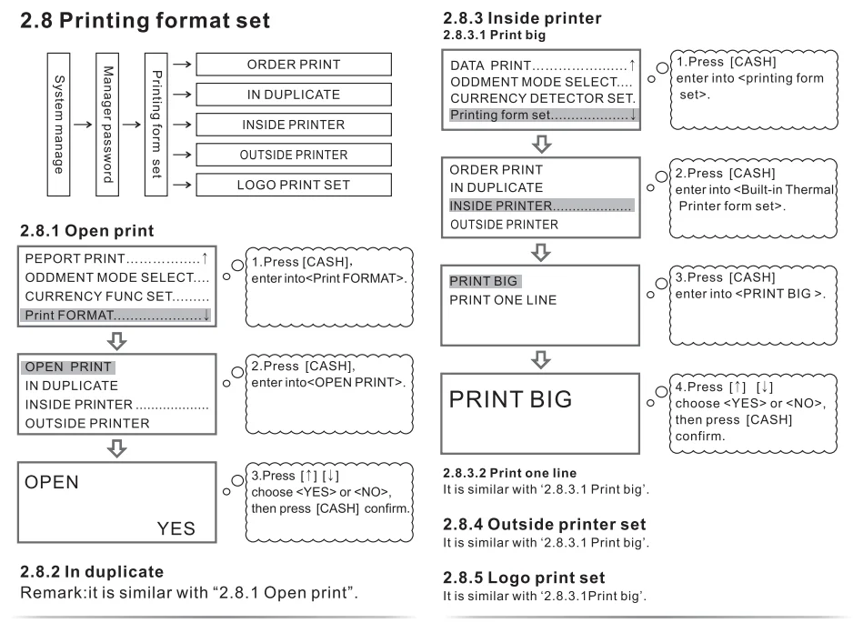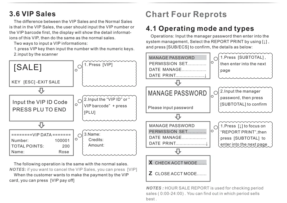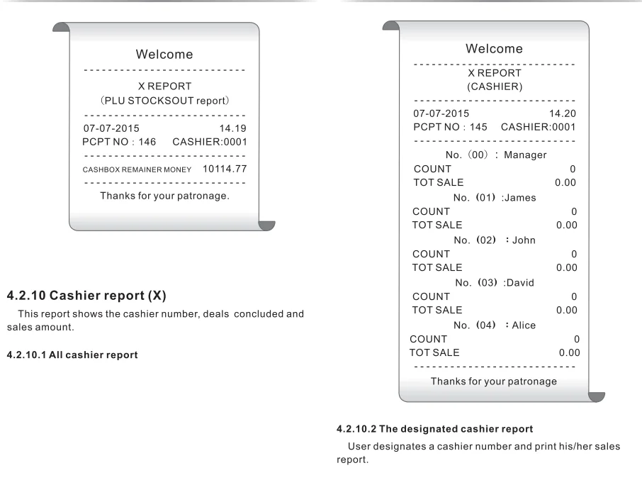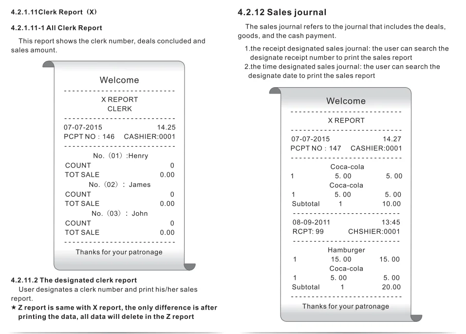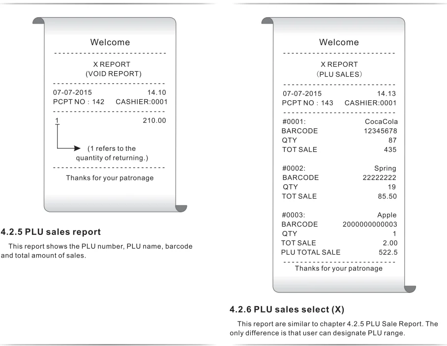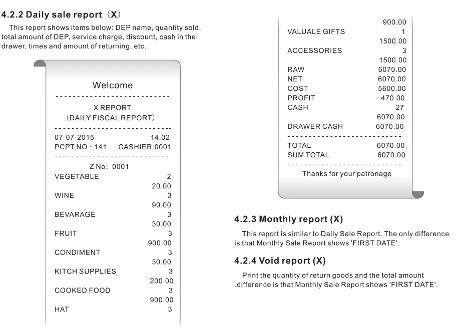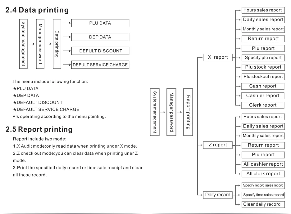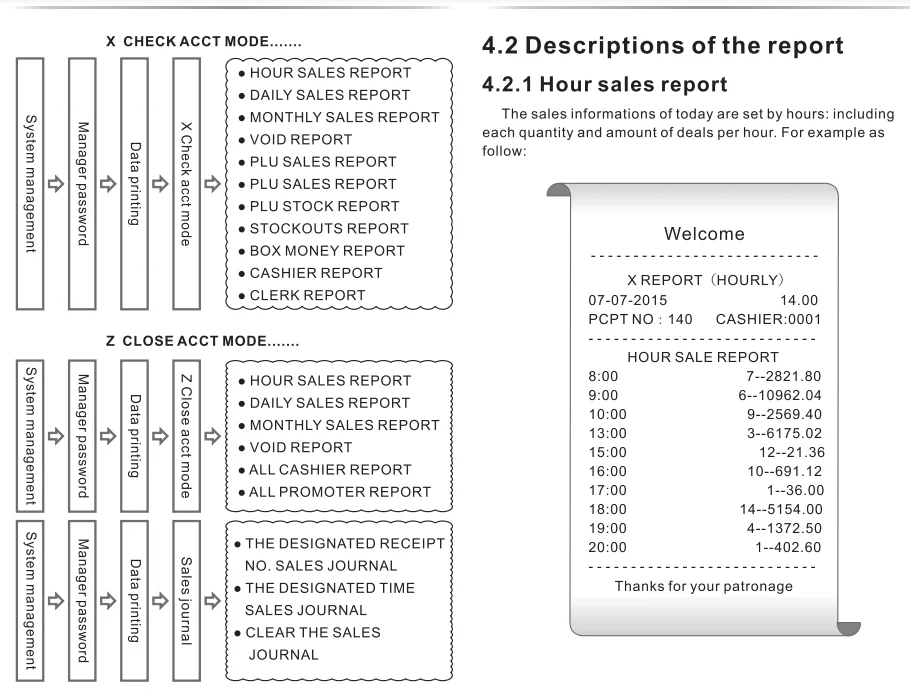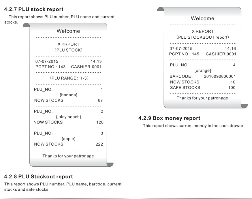 report printing: hours, days sales, monthly sales, PLU summary, PLU inventory, single-product out of stock, cash