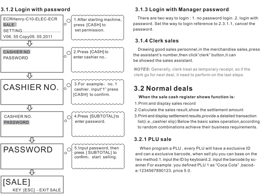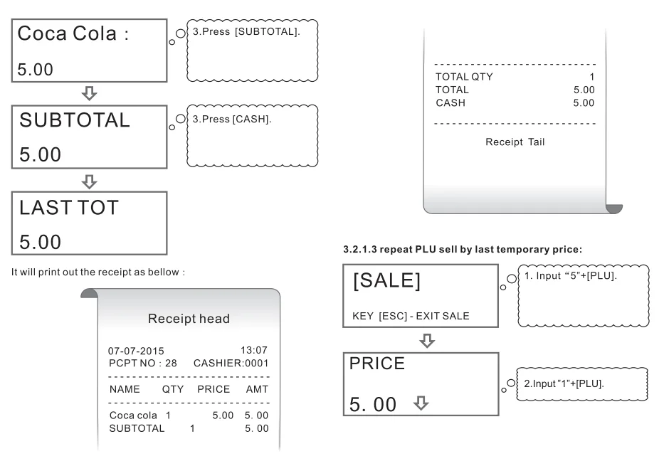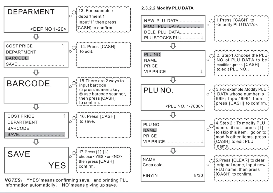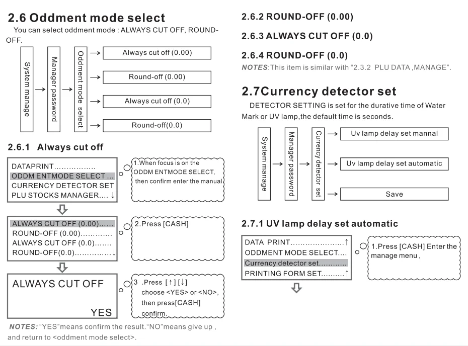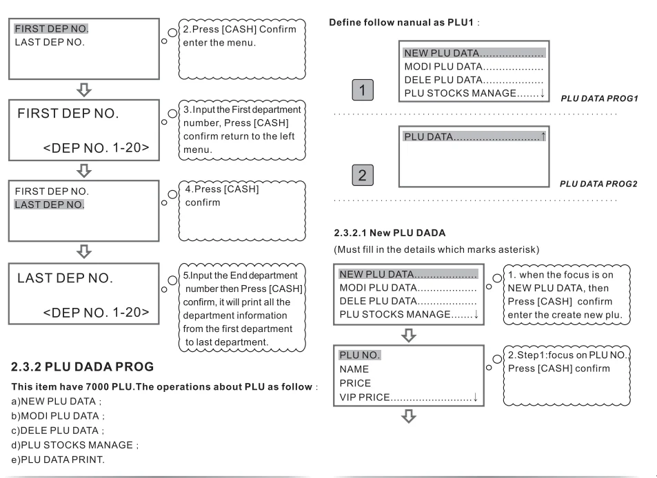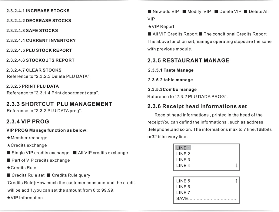 Report printing: time, sales, monthly sales, PLU summary, PLU inventory, single items out of stock, cash.