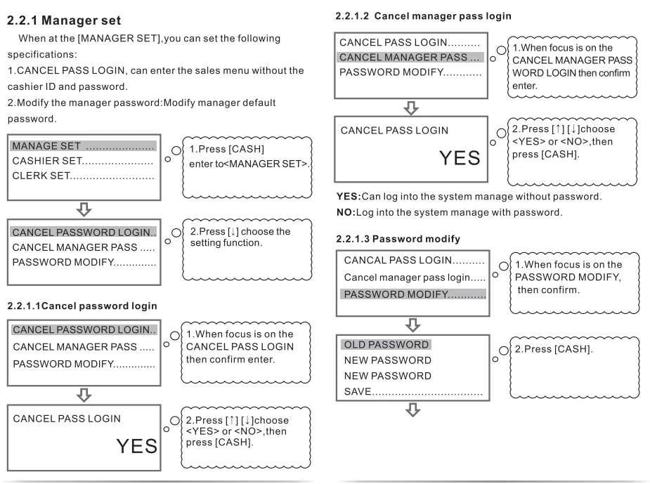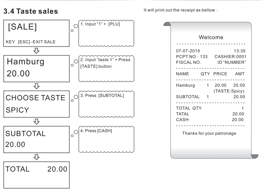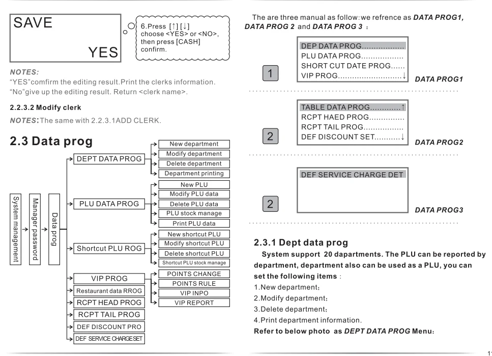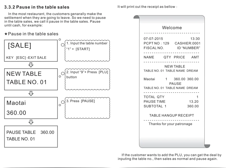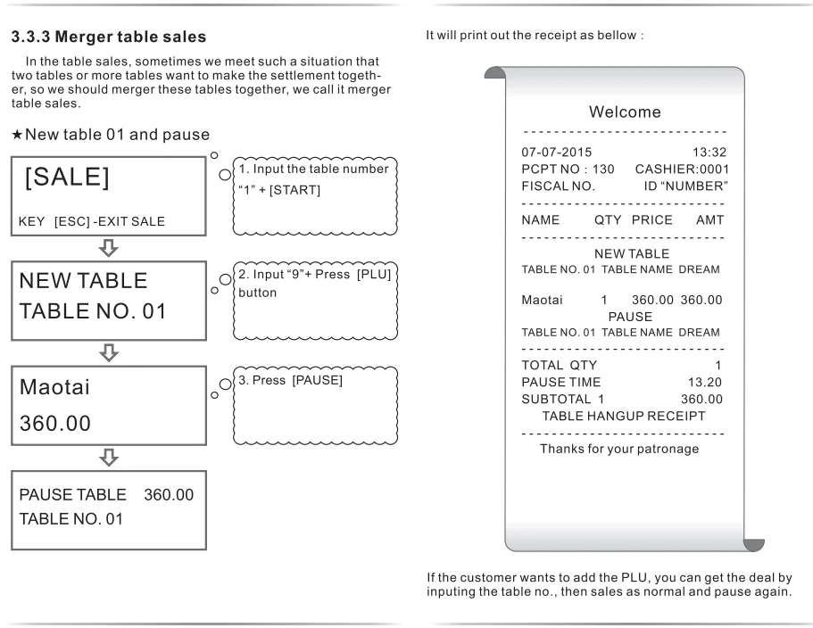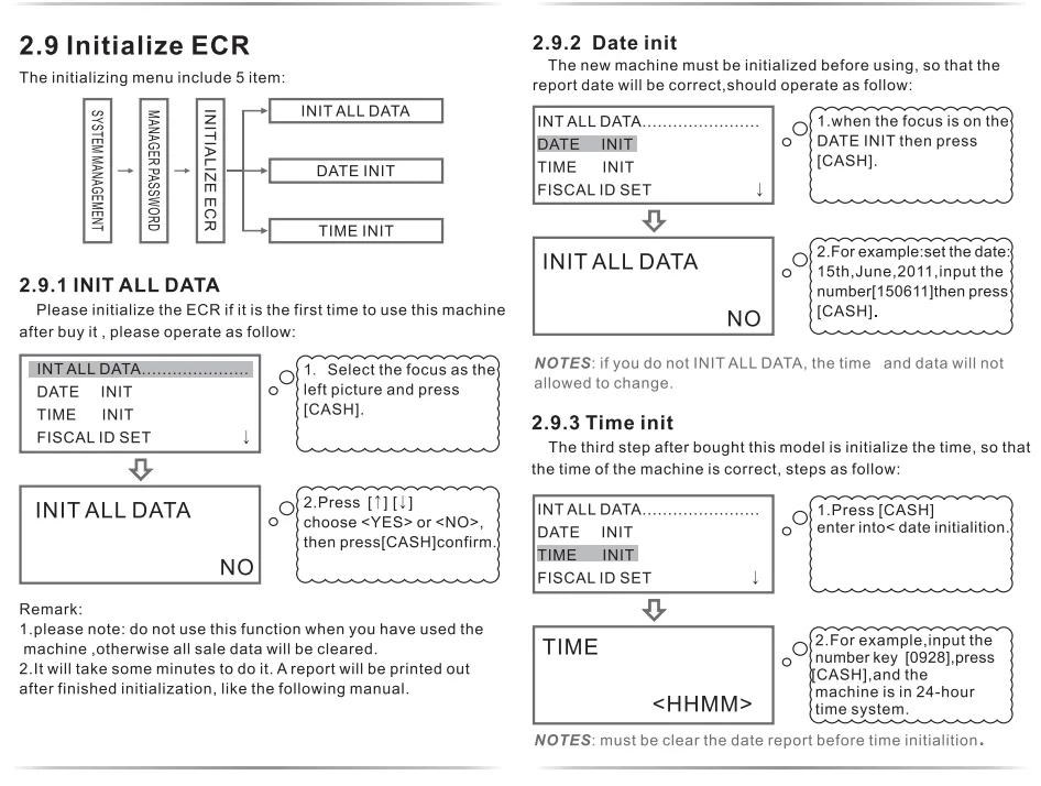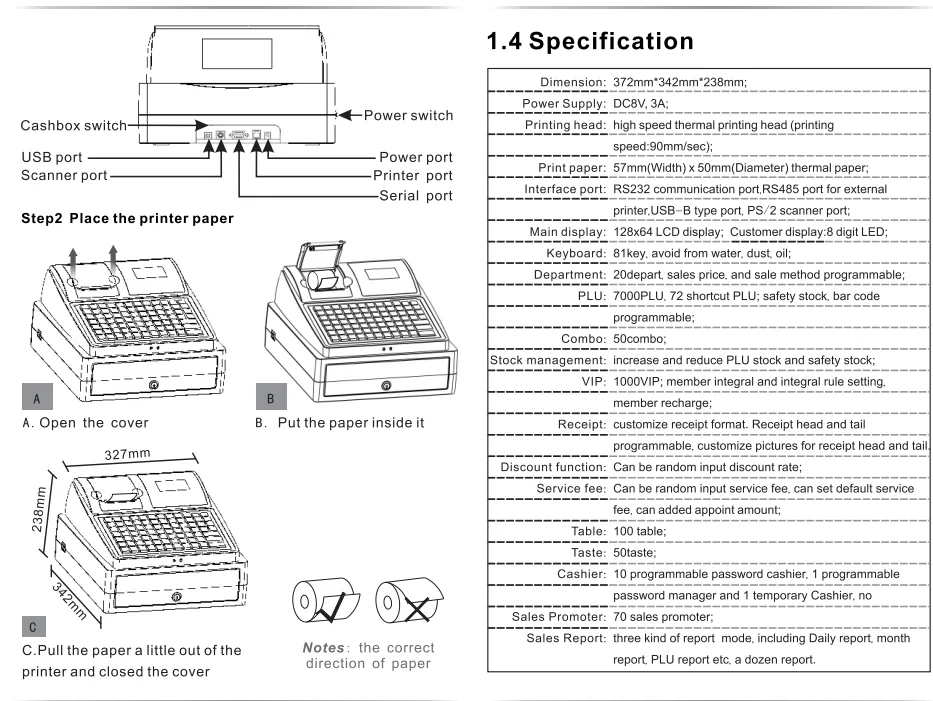 Report printing: time, sales, monthly sales, PLU summary, PLU inventory, single items out of stock, cash.