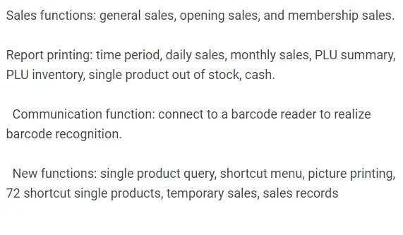 New features: single product query, shortcut menu, picture printing, 72 fast single product, temporary sales, sales records
