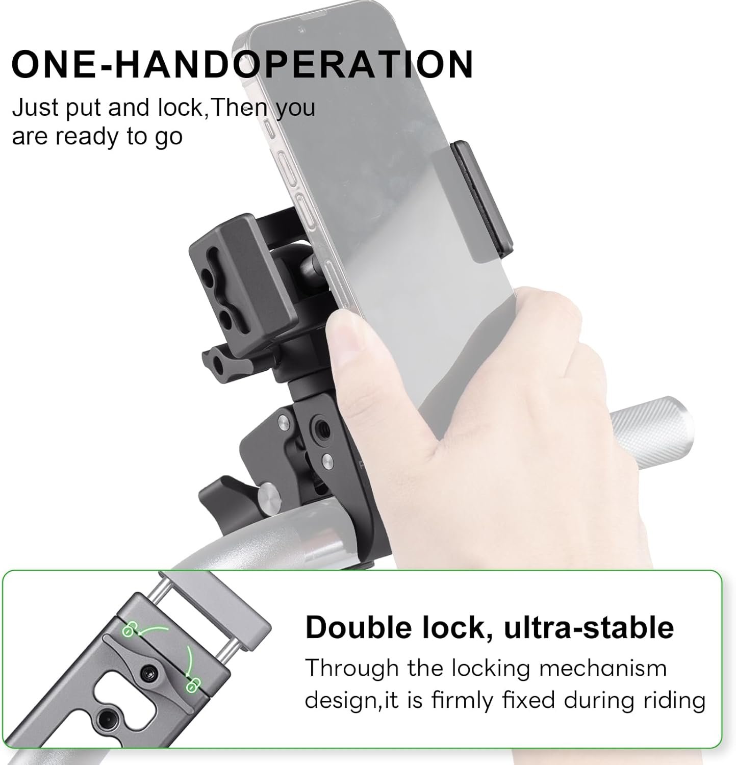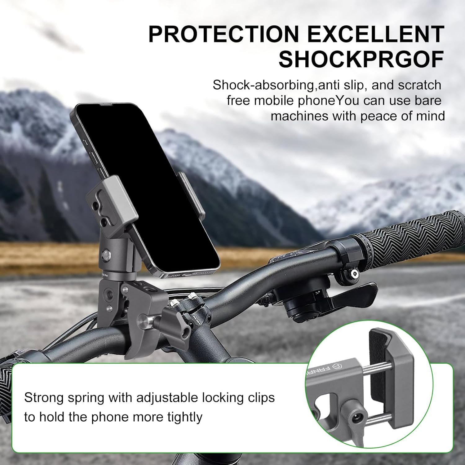 Double-layer shockproof protection: Both corners of the phone clamp are covered with cushioning rubber pads to prevent your phone from falling. The handlebar clamp ensures your phone remains safe and visible during riding, and the strong spring is matched with an adjustment lock. Ensure that your phone is protected even when riding at high speeds.