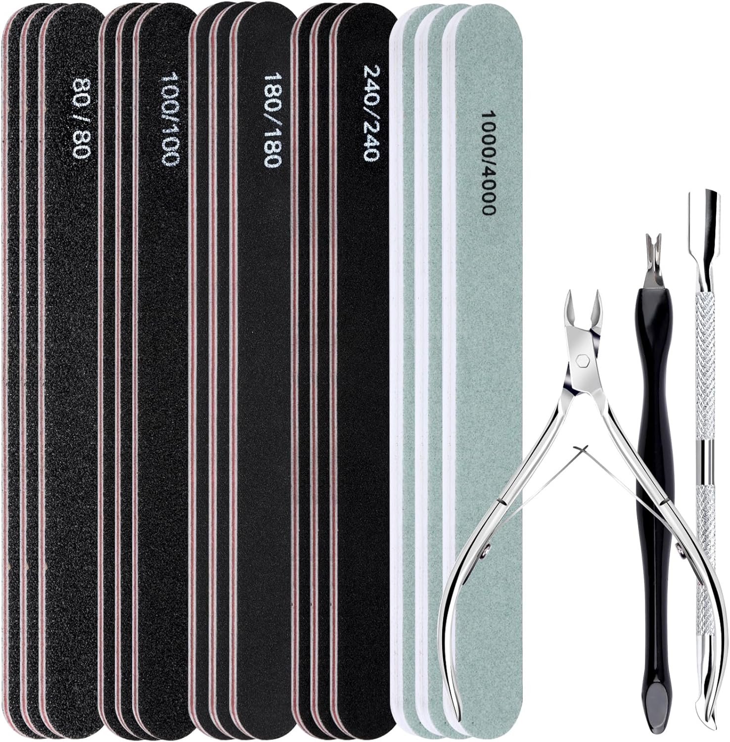 Complete Nail File Kit For Manicure: What you will get: 3 x 80/80 grit nail files; 3 x 100 grit nail files; 3 x 180 grit nail file; 3 x 240 grit nail file; 3 x polishing files 1000/4000; 1 x nail cuticle trimmer; 1 x nail cuticle pusher; 1 x nail cuticle fork