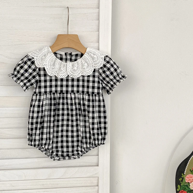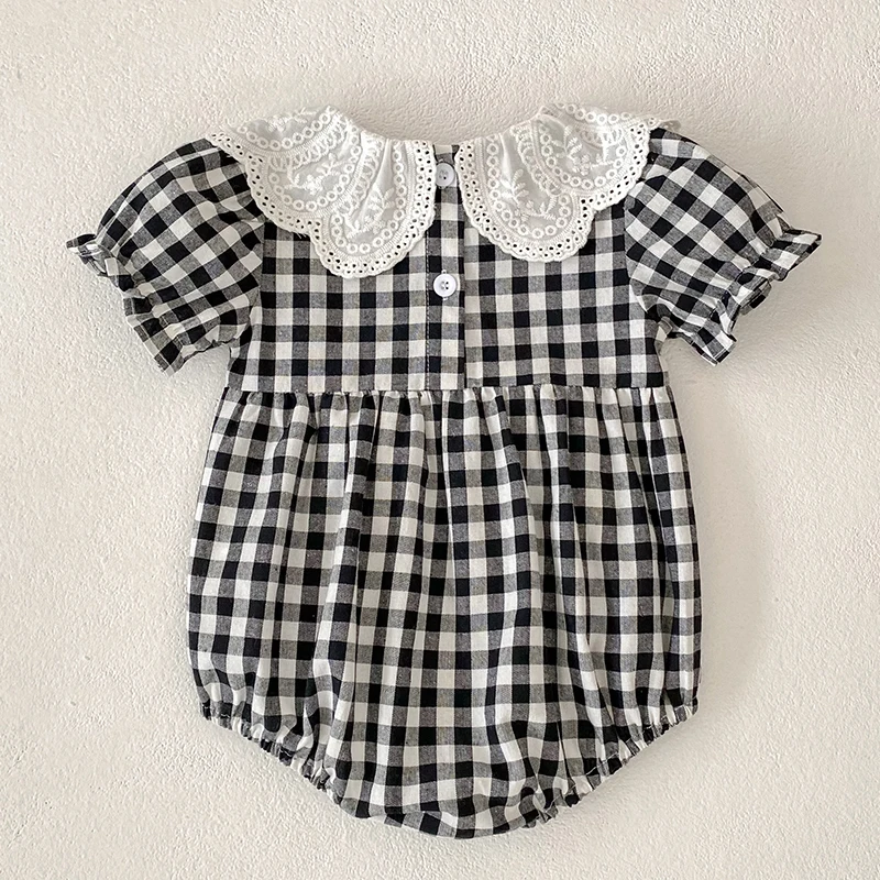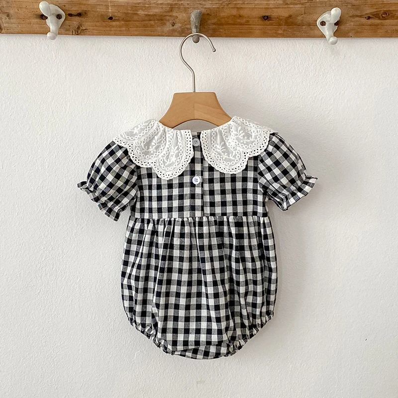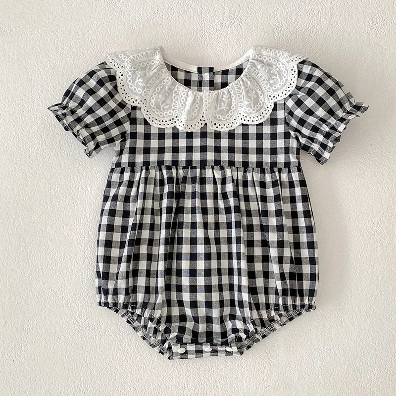 Fashion Clothing Summer Girls Jumpsuits Toddler Infant Baby Girl Short Sleeve Doll Collar Plaid Button Romper Jumpsuit Outfit