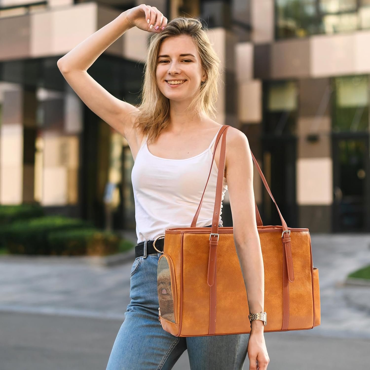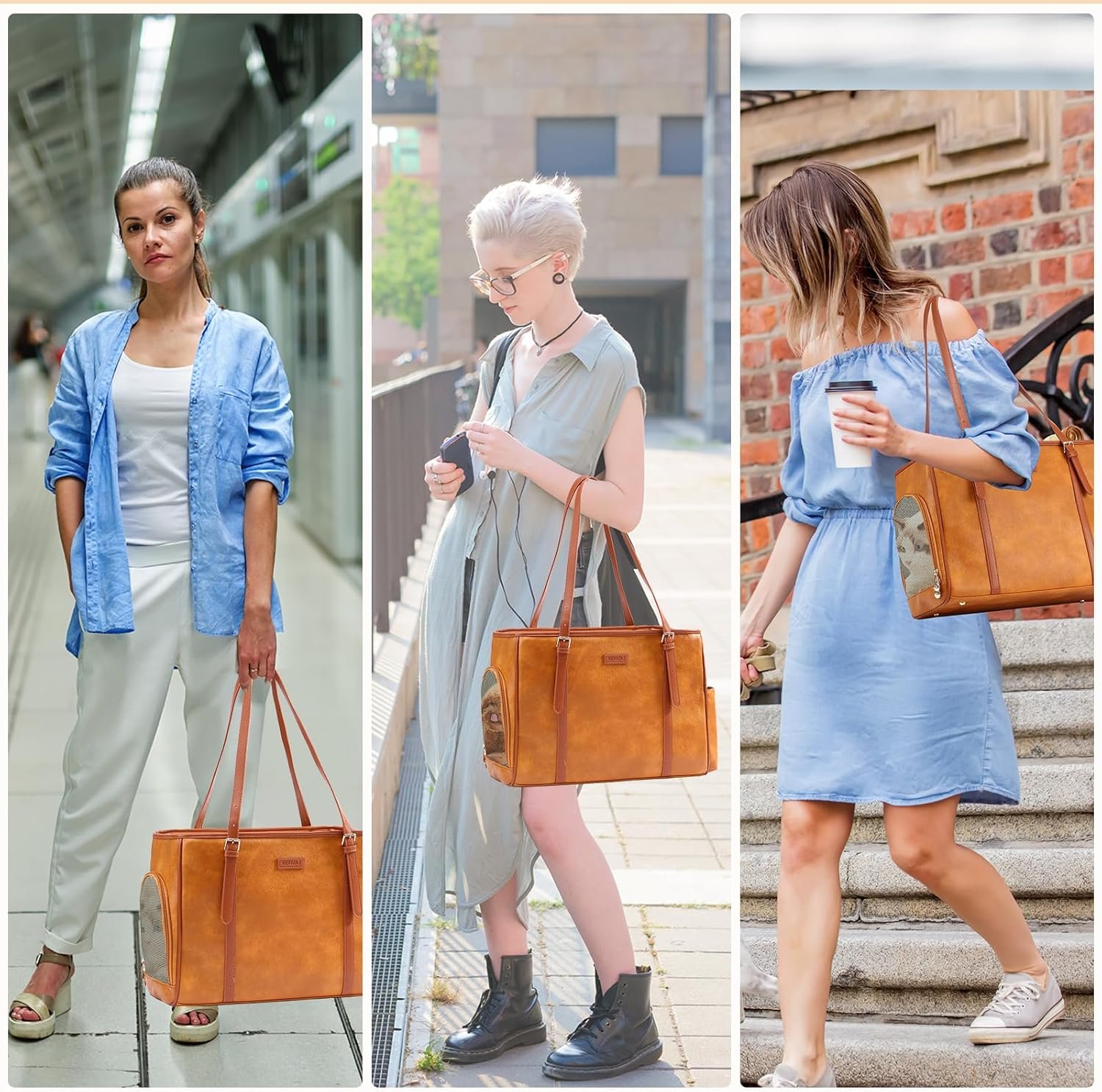 Fashion Dog Purse Pet Carrier Leather Bag for Small Dogs Cats Puppy, Portable Tote Bag Airline Approved Soft-Sided Carriers (Brown)