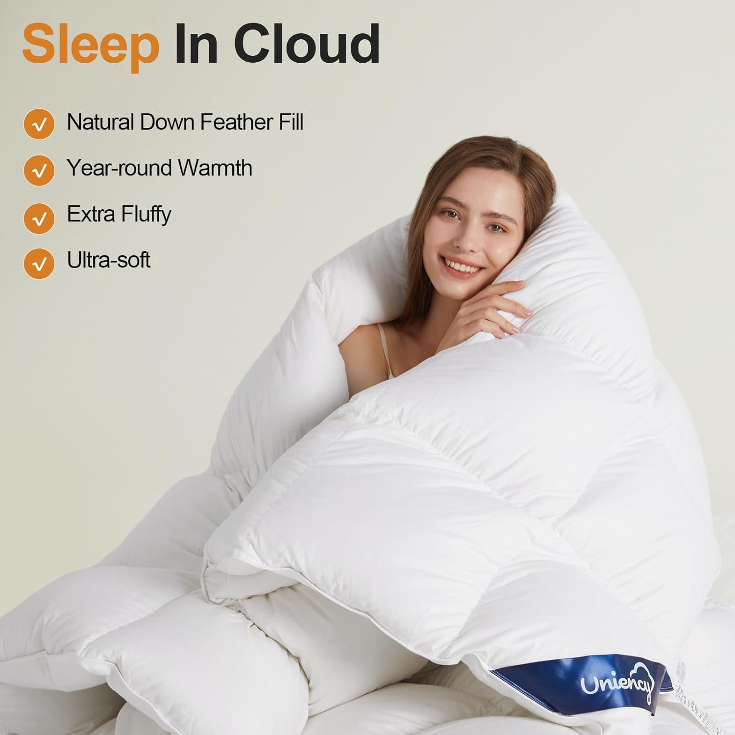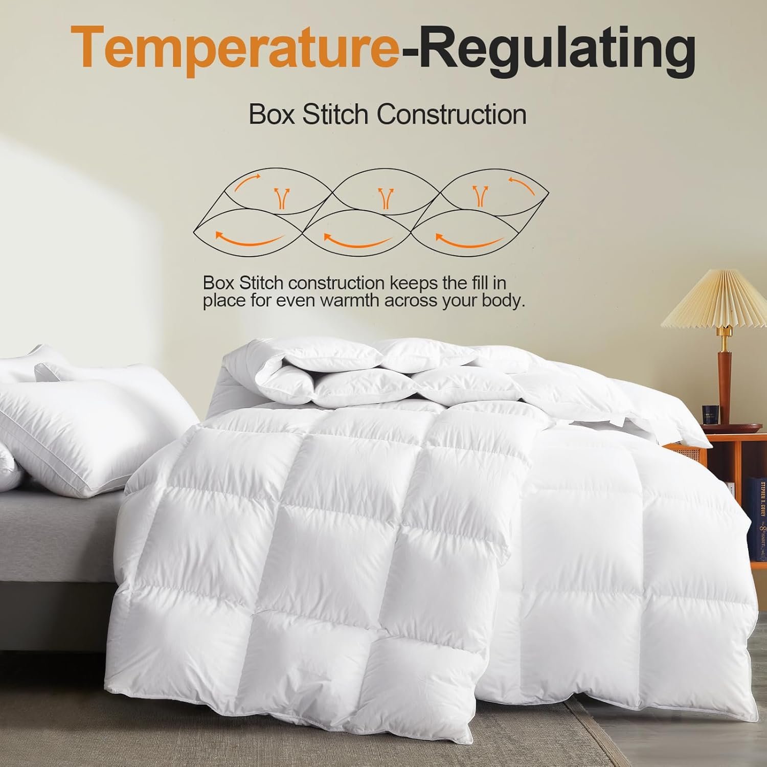 Elegant Design: To ensure the even distribution of filling, our feather comforter king size features box stitching. This advanced stitching technique creates discrete compartments within the down comforter, each housing an equal amount of filling. With 4 sturdy corner tabs and 4 middle loops discreetly sewn into the king duvet insert, you can effortlessly secure it inside the duvet cover. No more shifting or bunching during sleep.