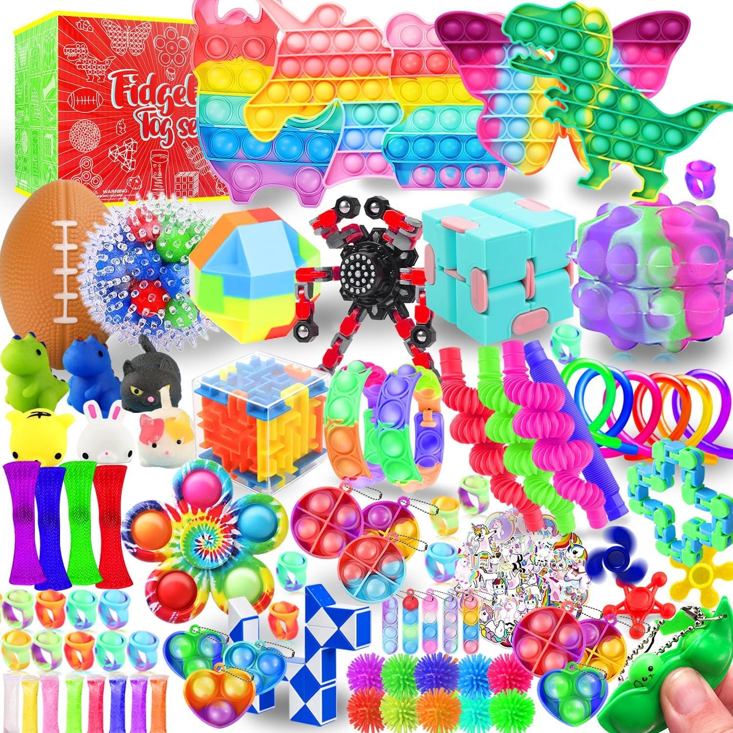 PACK OF 160: 5 Pop Bubbles, 1 Squishy Ball, 6 Mochi Squishies, 6 Stretchy Strings, 4 Marble Mesh Fidget Toys, 1 Snake Cube Twist, 1 Tracks Snap, 1 Infinity Cube, 2 Puzzle Boxes, 1 Squeeze Soybean, 1 Pop Fidget Spinner, 2 Pop Bracelets, 35 Mini Pop Fidget Toys , 8 Foam Putty, 1 Chain Robot Spinner, 1 Pop Ball, 30 Spiky Balls, 1 Football Foam Ball, 36 Mini Pop Bubbles, 3 Mini Fidget Spinners and 4 Pop Tubes.