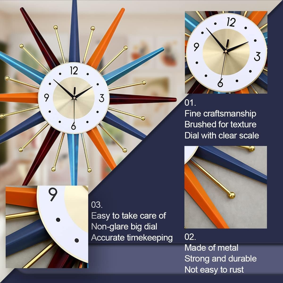 High-Quality Material: This large starburst wall clock is made of metal, with a gleaming gold finish. The dial shines after processing. The combination of handmade and ironwork creates extraordinary artistic charm.