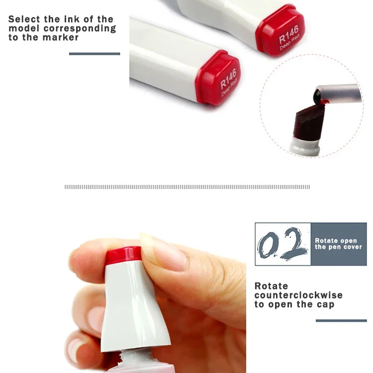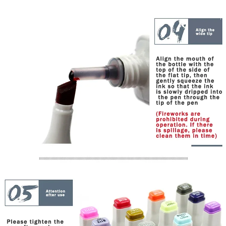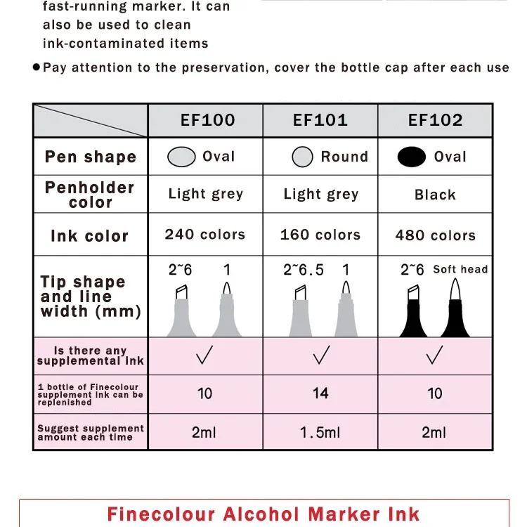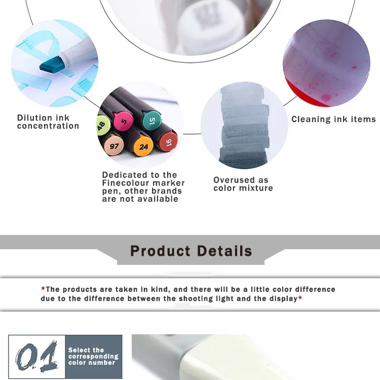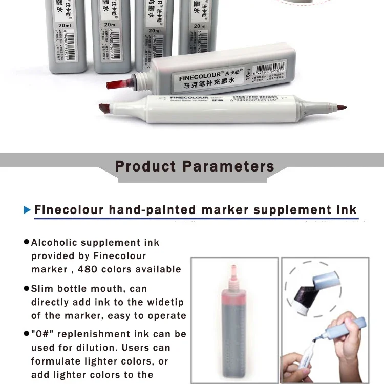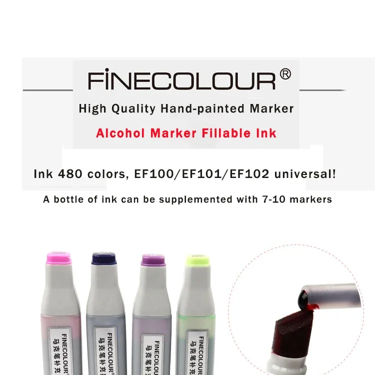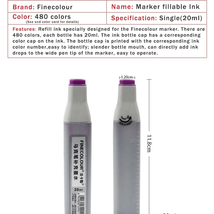 Features: Refill ink specially designed for the Finecolour marker. There are 480 colors, each bottle has 20ml. The ink bottle cap has a corresponding color cap on the ink. The bottle cap is printed with the corresponding ink color number,easy to identify; slender bottle mouth, can directly add ink drops to the wide pen tip of the marker, easy to operate