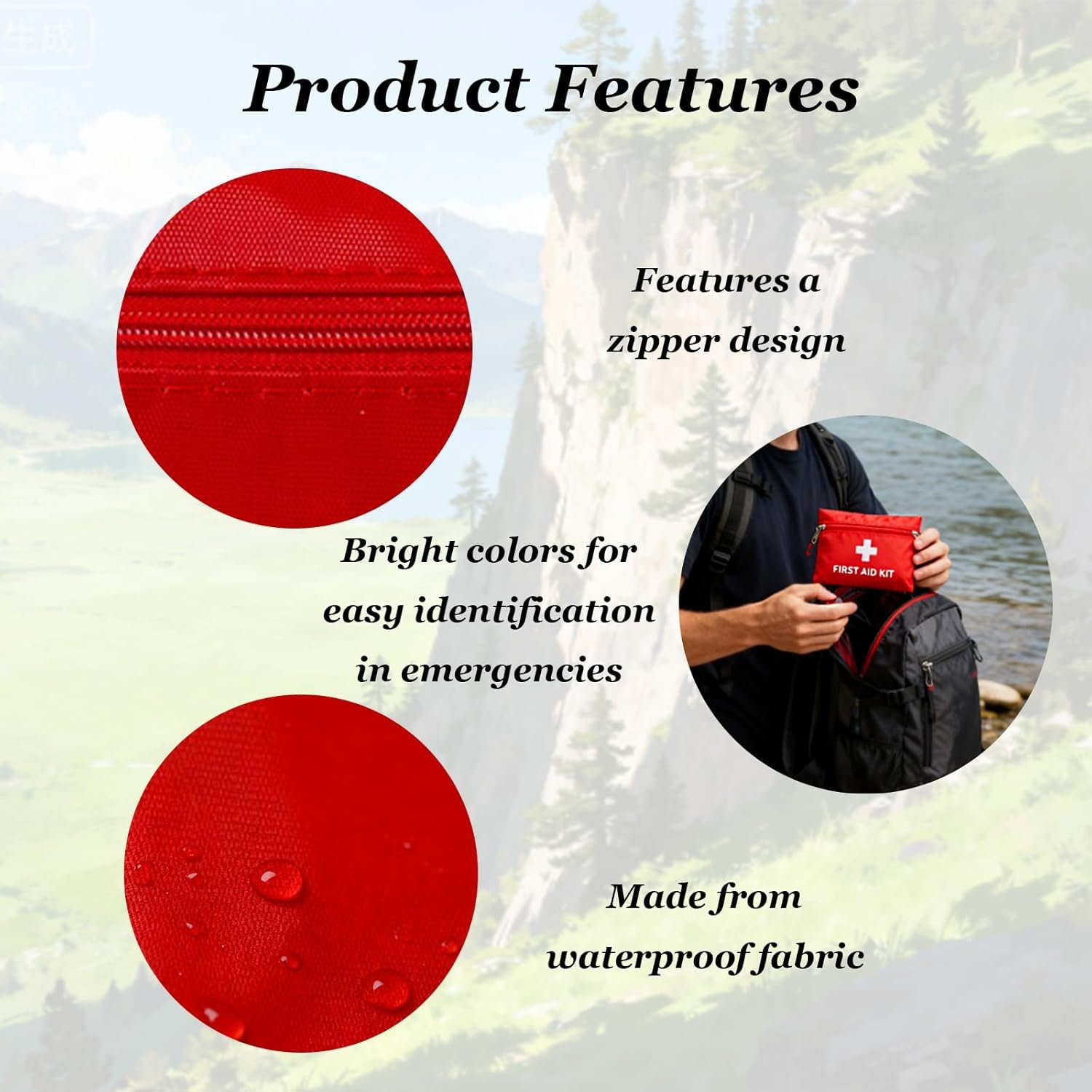 Material:This first aid bag is made with waterproof fabric,adopt with zipper design,easy to find emergency.