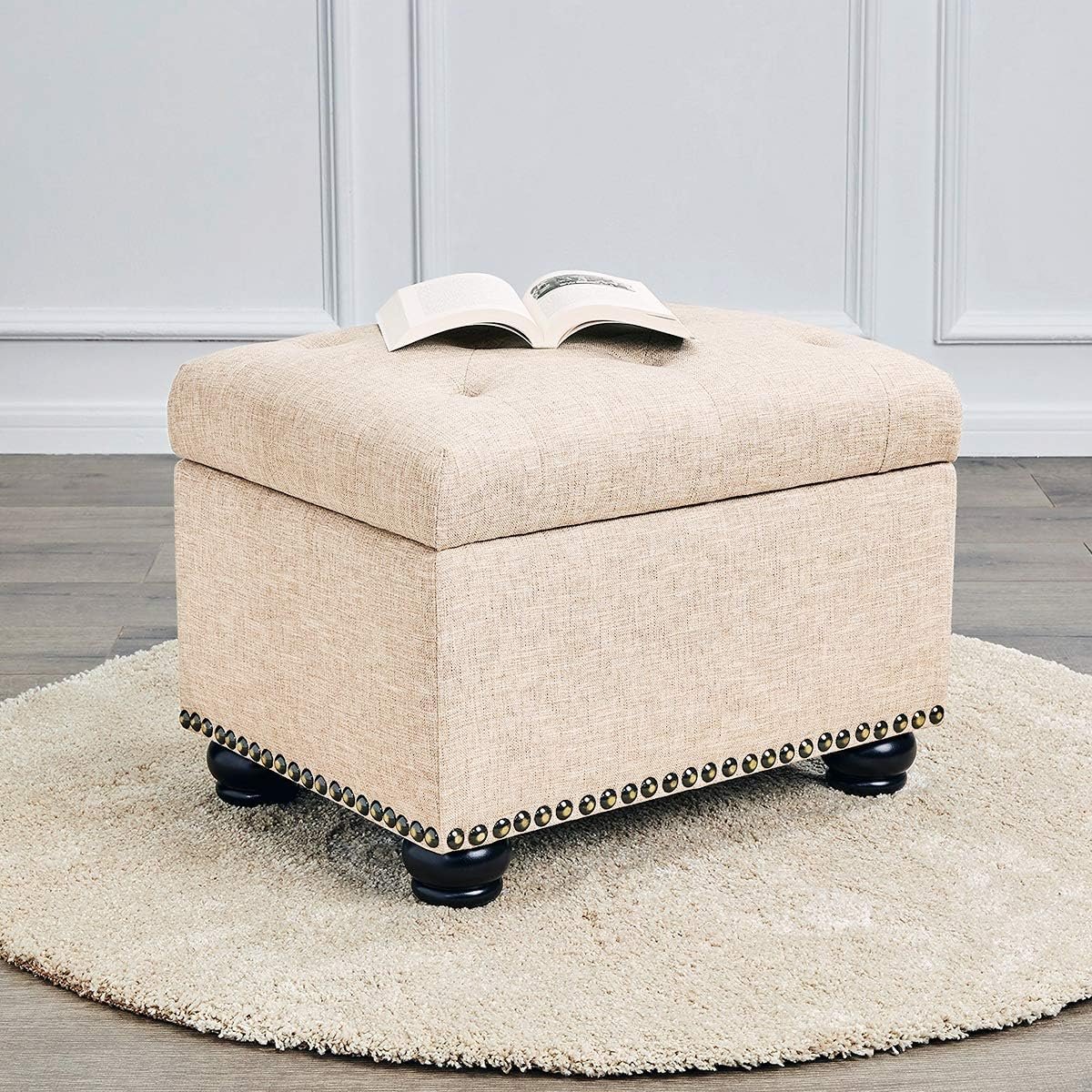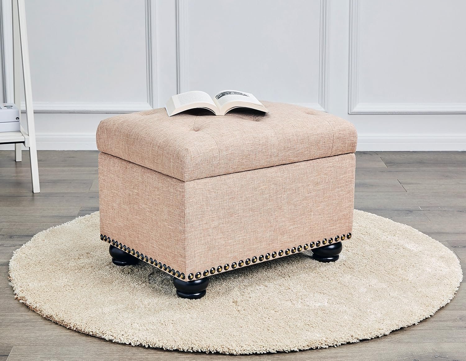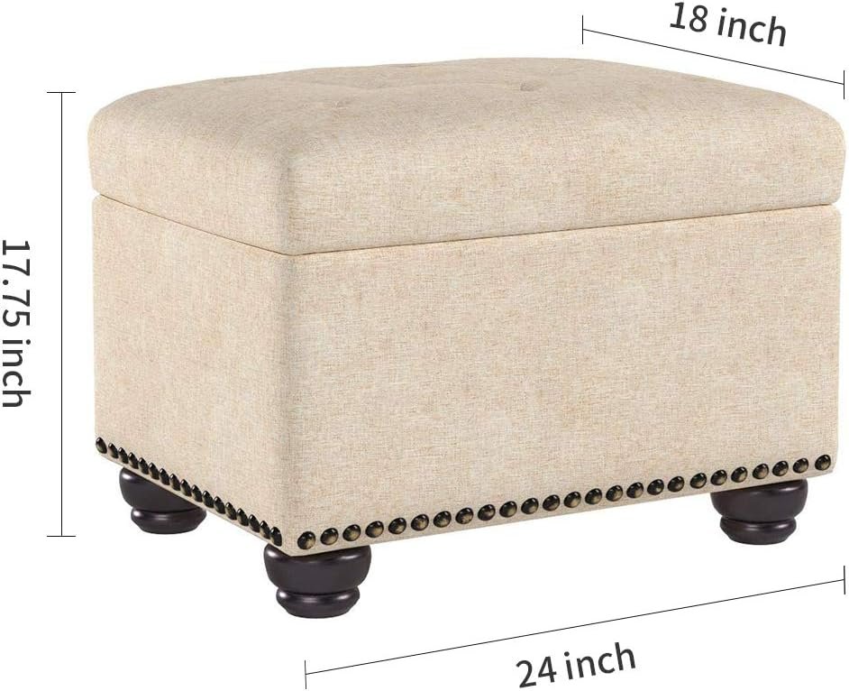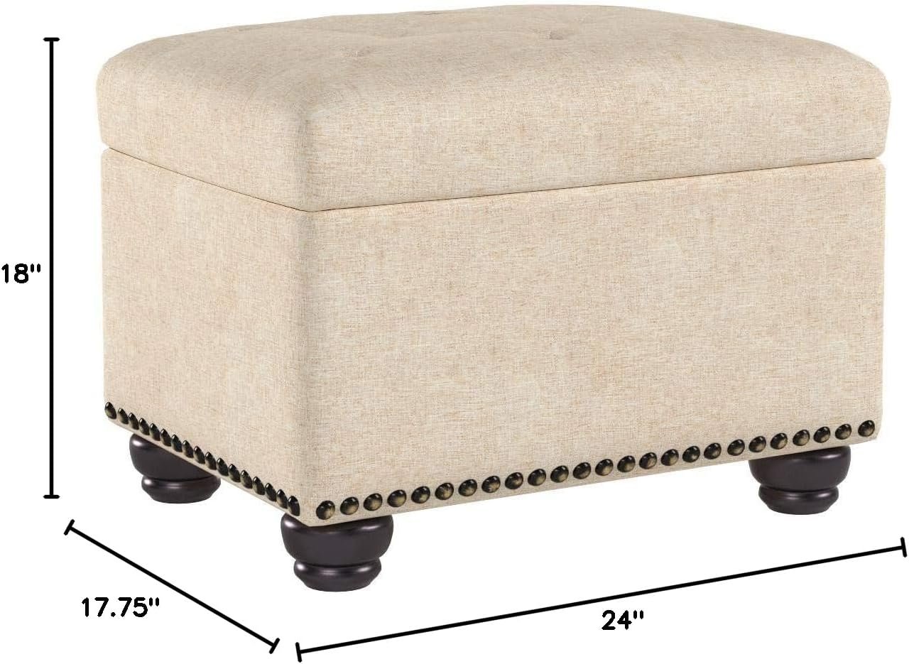 This First Hill 5th Ave Modern Tan Linen Upholstered Storage Ottoman measures 24″ length x 17.75″ width x 18″ height.