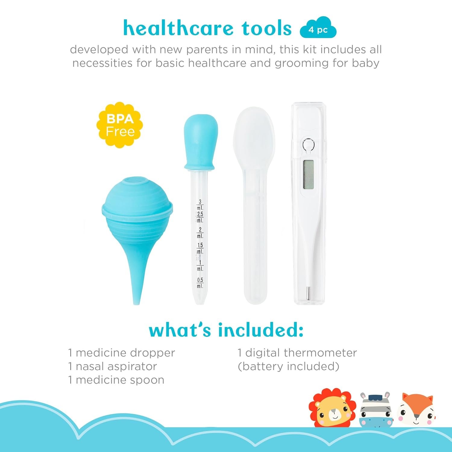 [Healthcare] Make baby healthcare easy with the included baby medicine dropper and baby medicine spoon, with both teaspoon and mL measurements on each medicine applicator. A baby thermometer makes temperature checks easy, and a nasal aspirator keeps baby snot-free.