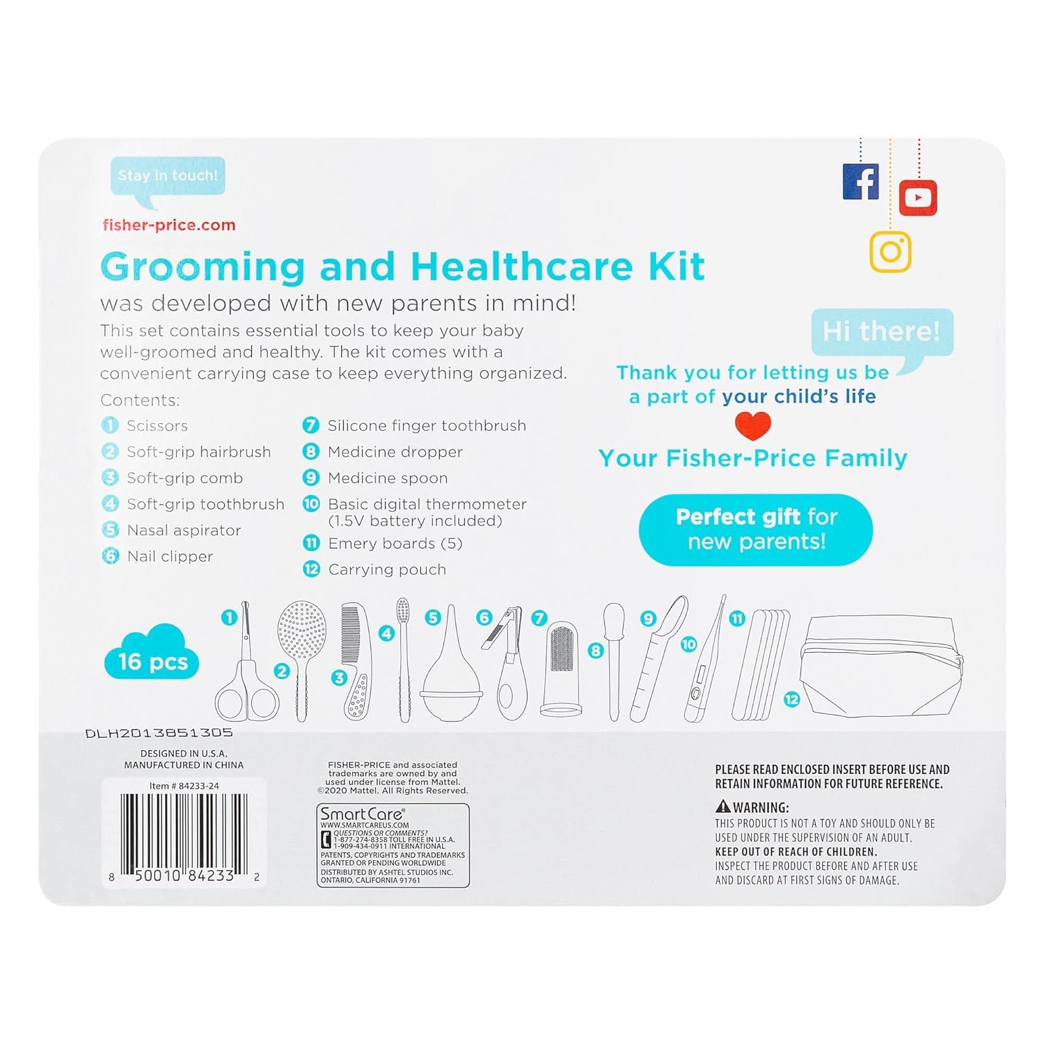 [What’s Included] The Smart Care Fisher-Price 6-Piece Baby Health Set includes a medicine dropper, baby nose aspirator, medicine spoon, baby nail clippers, baby thermometer, scissors, baby nail clippers, 5 emery boards, toothbrush, comb, hairbrush, toothbrush, finger toothbrush, and emergency card. A convenient travel zip case is also included, making it the perfect baby travel essential.