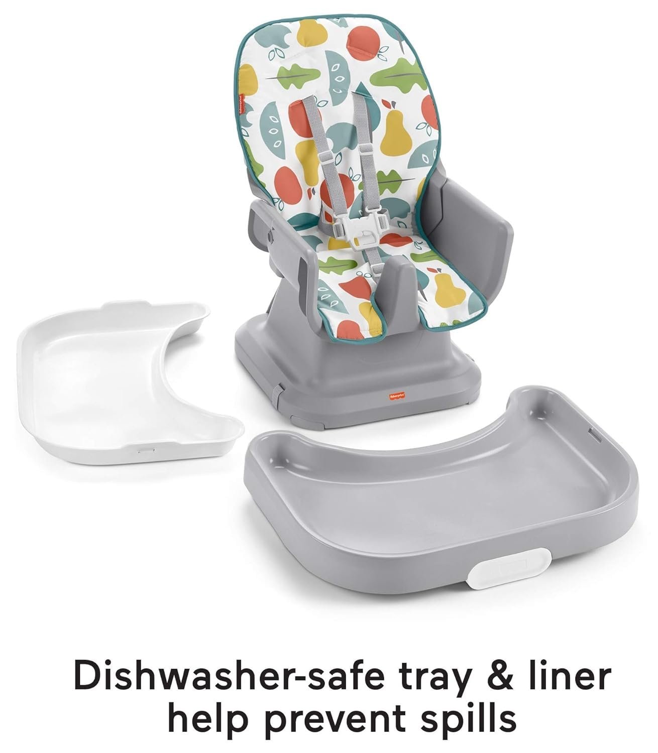 Dishwasher-safe tray and tray liner, plus machine-washable seat pad and 5-point harness