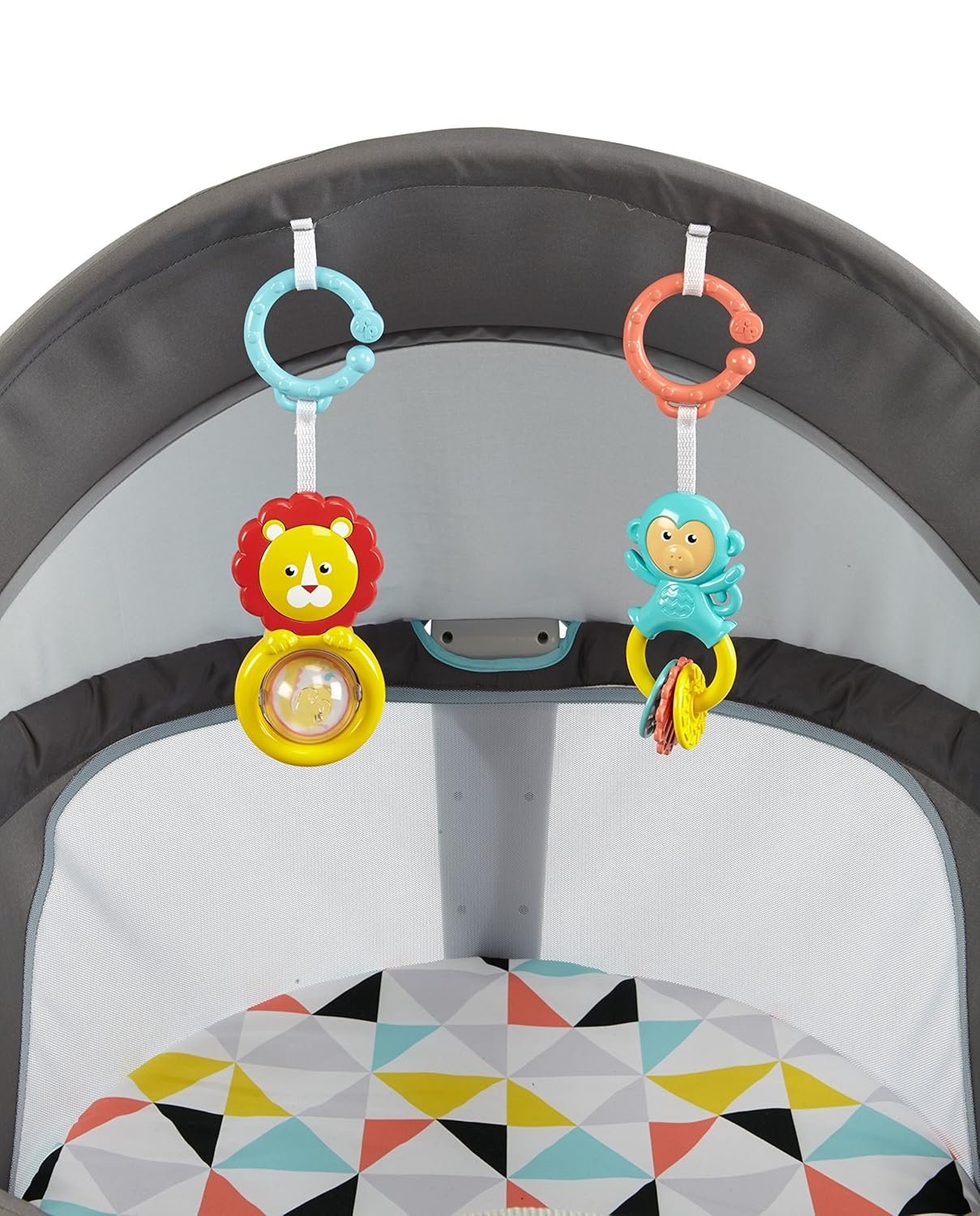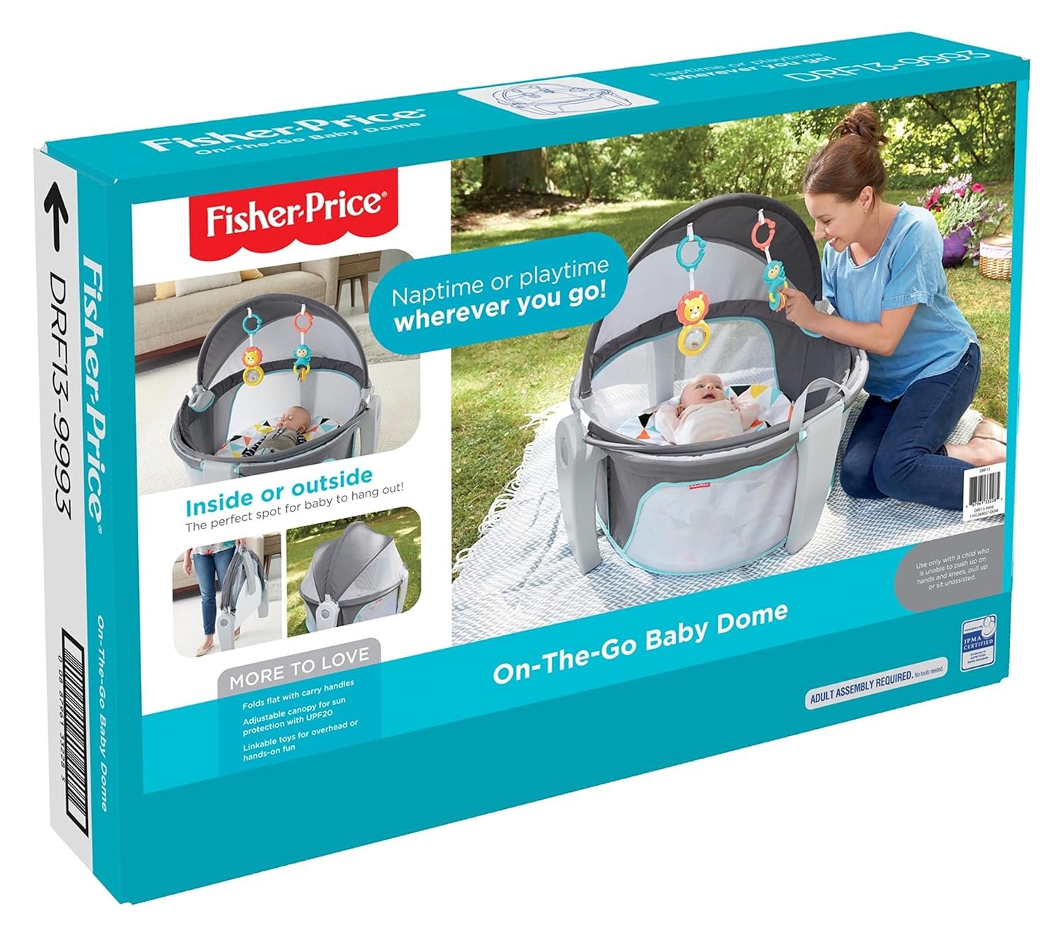 Baby feels right at home in the dome! That’s because it features a comfy pad for your little one to nap on or play on and a canopy that protects baby from sun and bugs. Use it indoors or out! Two colorful toys dangle overhead to encourage eye tracking. The toys can be removed and placed within baby’s reach for exploring the textures. And when you’re ready to pick up and go again, just fold the dome and use the handles to take it with you! It’s a great take-along for camping, picnics, a day at the beach, play dates, or a visit to grandma’s house. Where development comes into play Security & Happiness: Soft padding and sun blocking visor help baby feel secure when away from home. Fine Motor: Dome includes link toys that will keep baby busy while strengthening and developing fine motor skills.