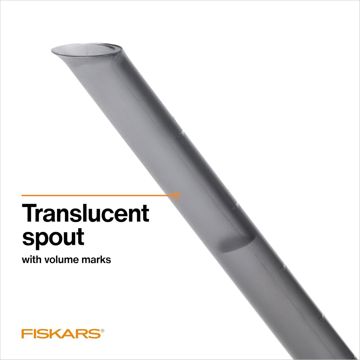 Fiskars water can has a translucent spout marked with volume measurements to allow for precise watering