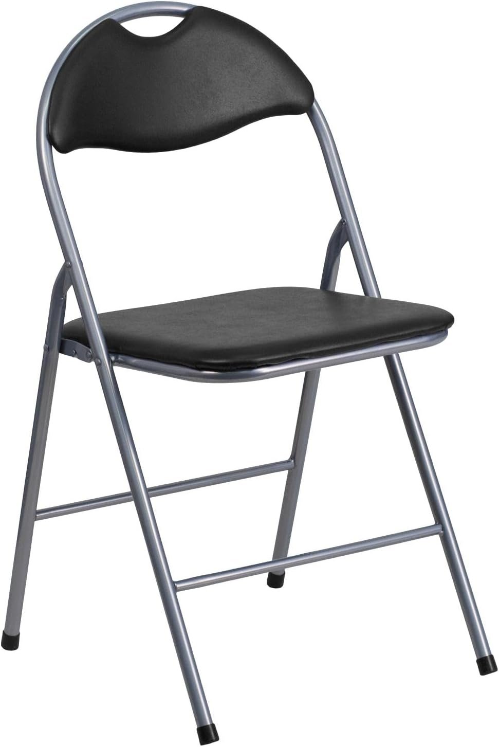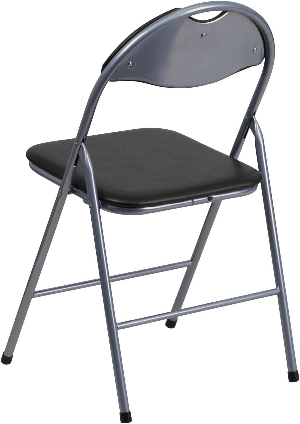 Always be ready for your next event or meeting with the Flash Furniture Hercules Series Metal Folding Chairs with Carrying Handles. Whether you’re hosting a game night, catering event, get-together, business meeting, school function, or other social or professional event, these folding chairs offer a reliable, on-demand seating solution for commercial or home use. The 1″ thick foam padded seat provides superior comfort for your guests during long events, while the double braced legs maximize stability and double as a convenient footrest. Made for portability and ease of use, the ultra-lightweight folding event chairs have a carrying handle built into the top and feature protective non-marring floor glides that won’t mark up or damage hard flooring surfaces while being moved around the venue. The durable 18-gauge steel frame with a gray powder coat finish withstands years of quality use and is suitable for outdoor use, however, the chairs should be stored indoors after use to protect the frame from extreme moisture. Each guest chair measures 17″W x 18″D x 31.5″H with no assembly required, and they support up to 300 pounds of static weight. As needed, the low-maintenance chairs can be wiped down with water and a dry cloth for quick and easy cleaning.