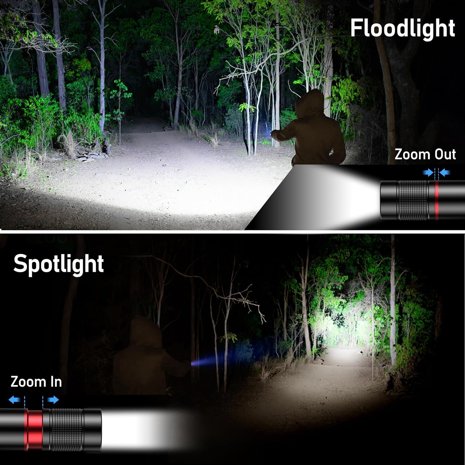 4 Lighting Modes and Zoomable: One button control of 4 lighting modes: High/Low/Strobe/SOS. The zoomable design adjusts the focus as needed, giving you the freedom to choose a spotlight or floodlight for long distances or larger illuminated areas