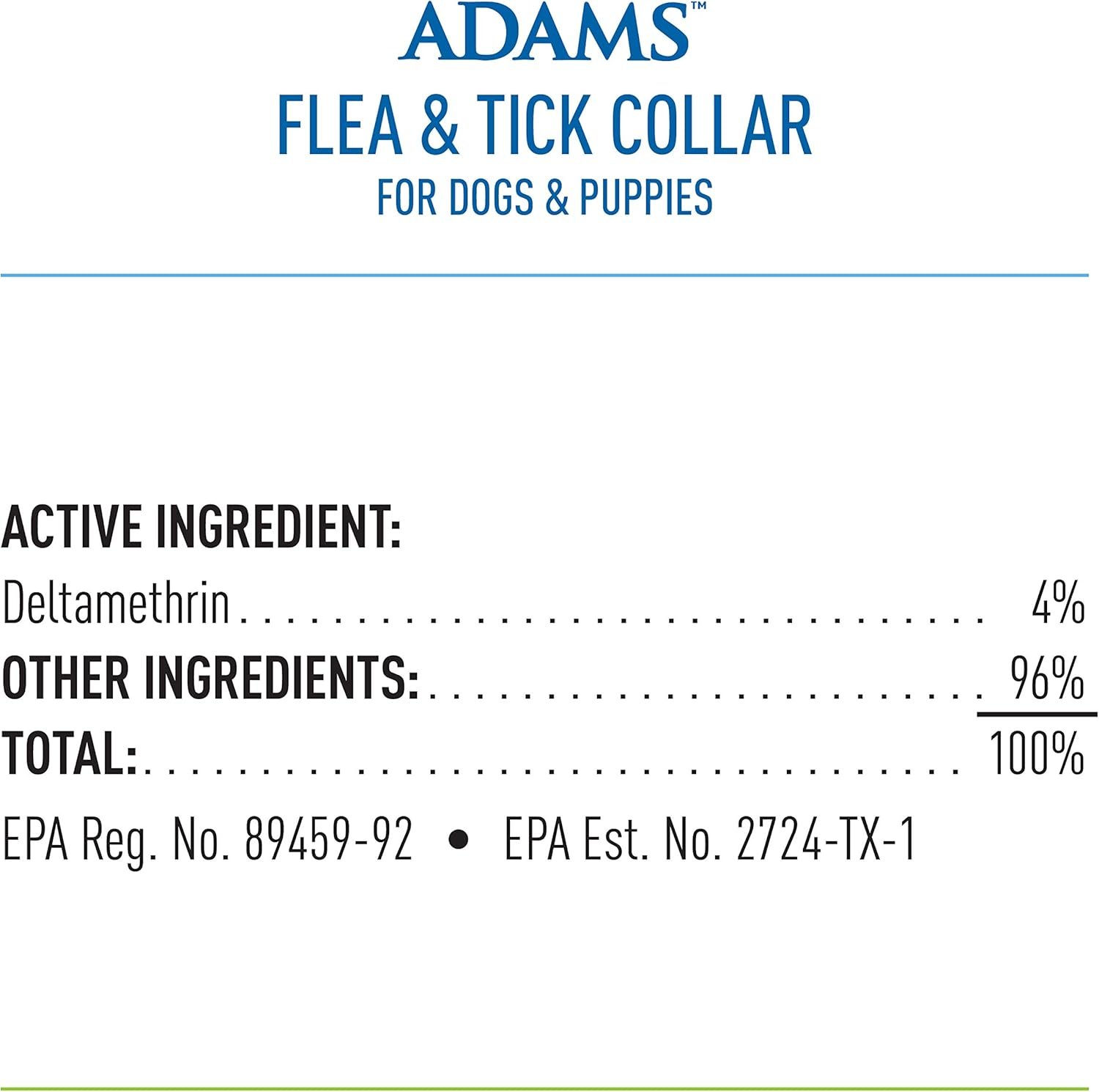 ADAMS Flea & Tick Control Collar for Dogs and Puppies kills fleas, ticks, flea eggs and flea larvae for up to 6 months. The active ingredient specifically targets flea eggs and flea larvae stopping their ability to mature and infest your home. ADAMS Flea & Tick Control Collar For Dogs and Puppies is an odorless, non-greasy alternative to topical treatments to kill fleas that may cause flea allergy dermatitis and flea bite anemia. Our one-size-fits-all flea and tick collar is adjustable to fit small dogs, medium dogs, and large dogs over 12 weeks. This collar can also be worn with a regular collar. It is water-resistant and does not need to be removed if it gets wet. With 5% of fleas living on your dog and the remaining 95% living in your home or yard, it is important to also address the infestations that can be occurring in your home and yard. ADAMS products are designed to provide you with the power to prevent pests on every front. Try ADAMS Flea & Tick Home Spray, specifically designed to use inside your home, and ADAMS Yard & Garden Spray, designed to use outside in your yard.