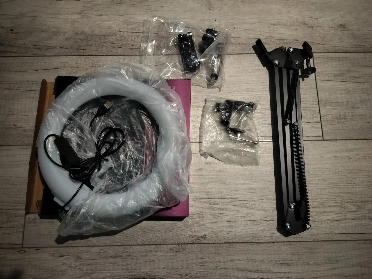 A high-quality tripod and lamp (for this price). When attaching the phone, you need to tighten the mount firmly. Works from a power bank, with a maximum brightness consumption of 1-1.2A.