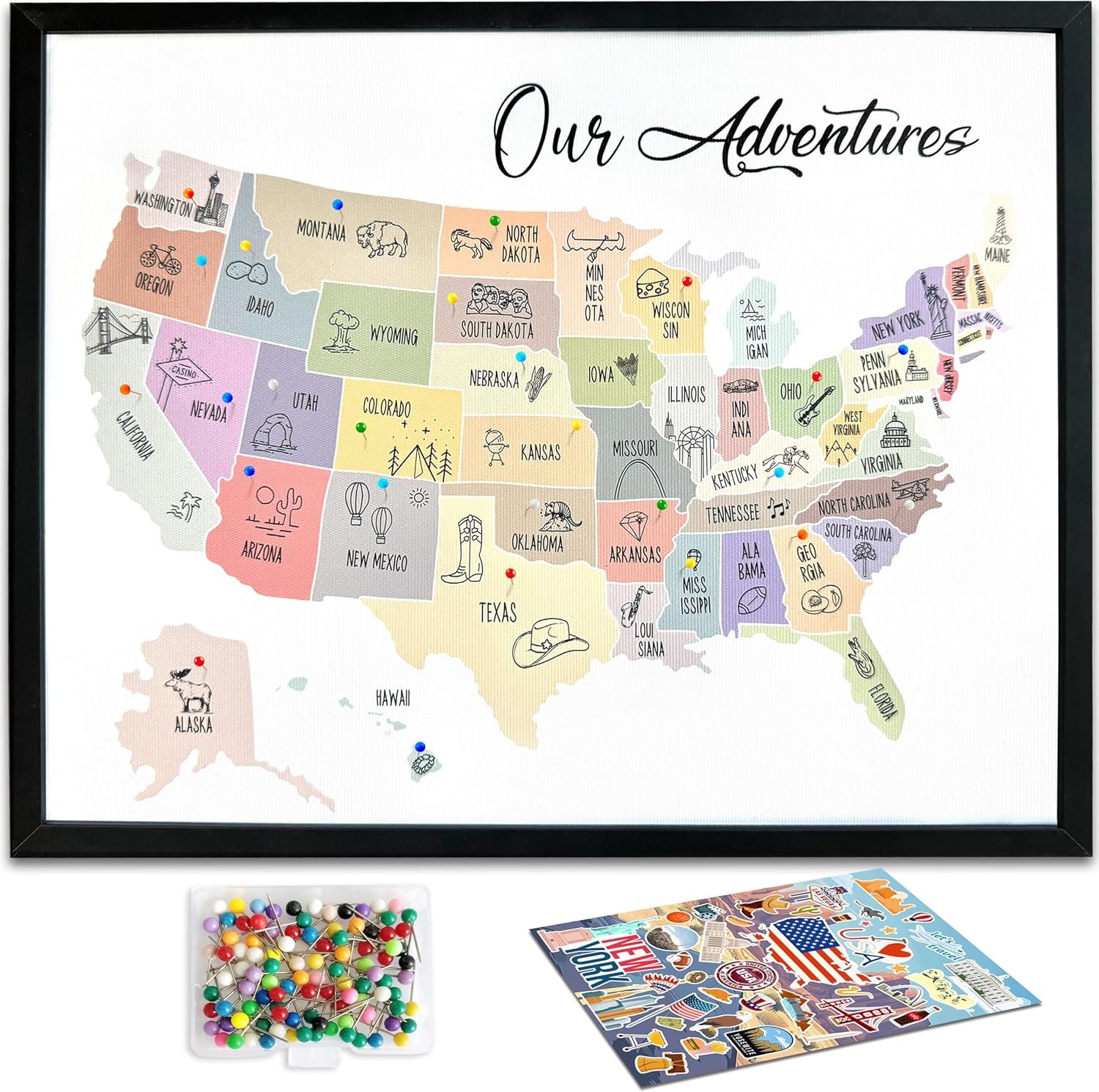 Track your adventures and decorate your walls with our high-quality unique design USA Push Pin map, featuring all 50 states with stunning landmark graphics!Printed on a beautiful high quality canvas with cork backing. This makes such a fun and unique gift for couples and families!