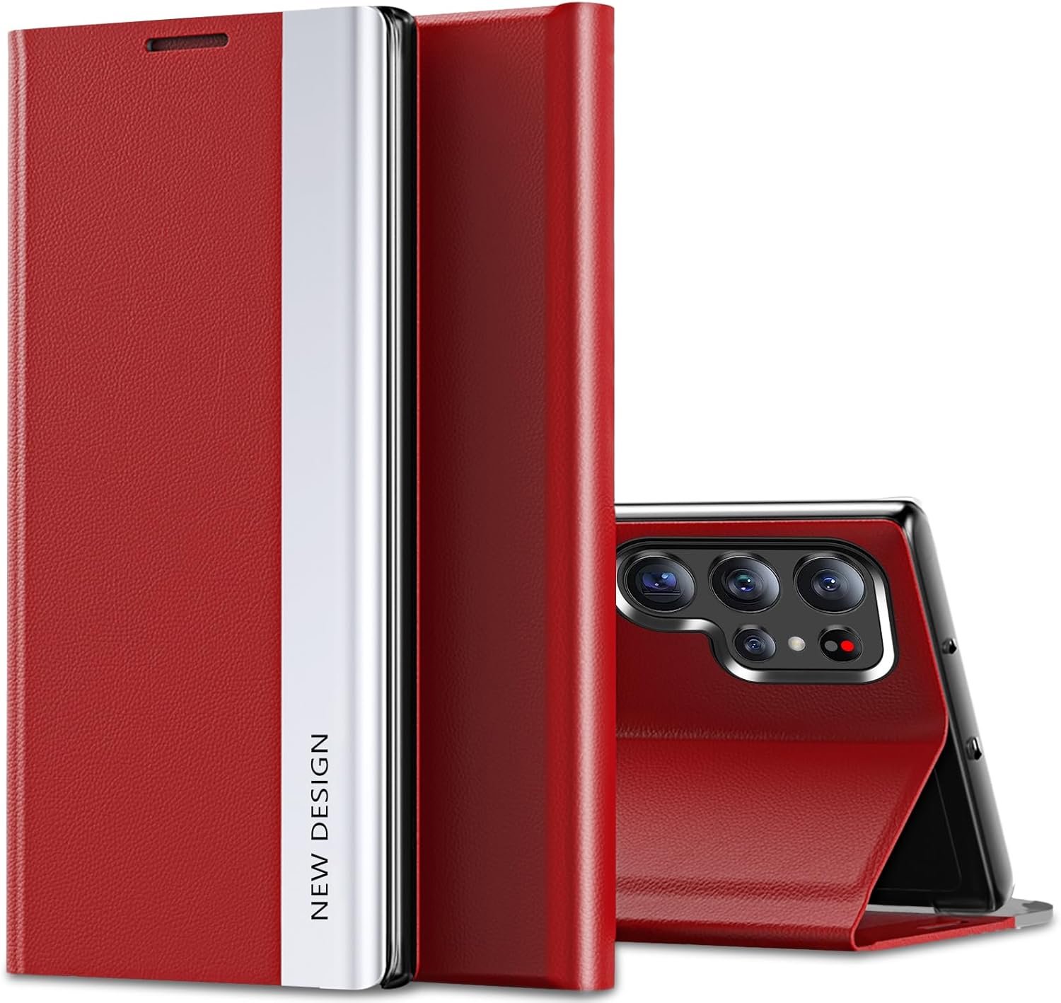 Flip Case for Samsung Galaxy S23 Ultra Case S View, Luxury Electroplating Ultra Slim for Samsung S23 Ultra Phone Case, PU & PC Hybrid Shockproof Flip Folio Cover Fit 6.8″ Smartphone (Red)