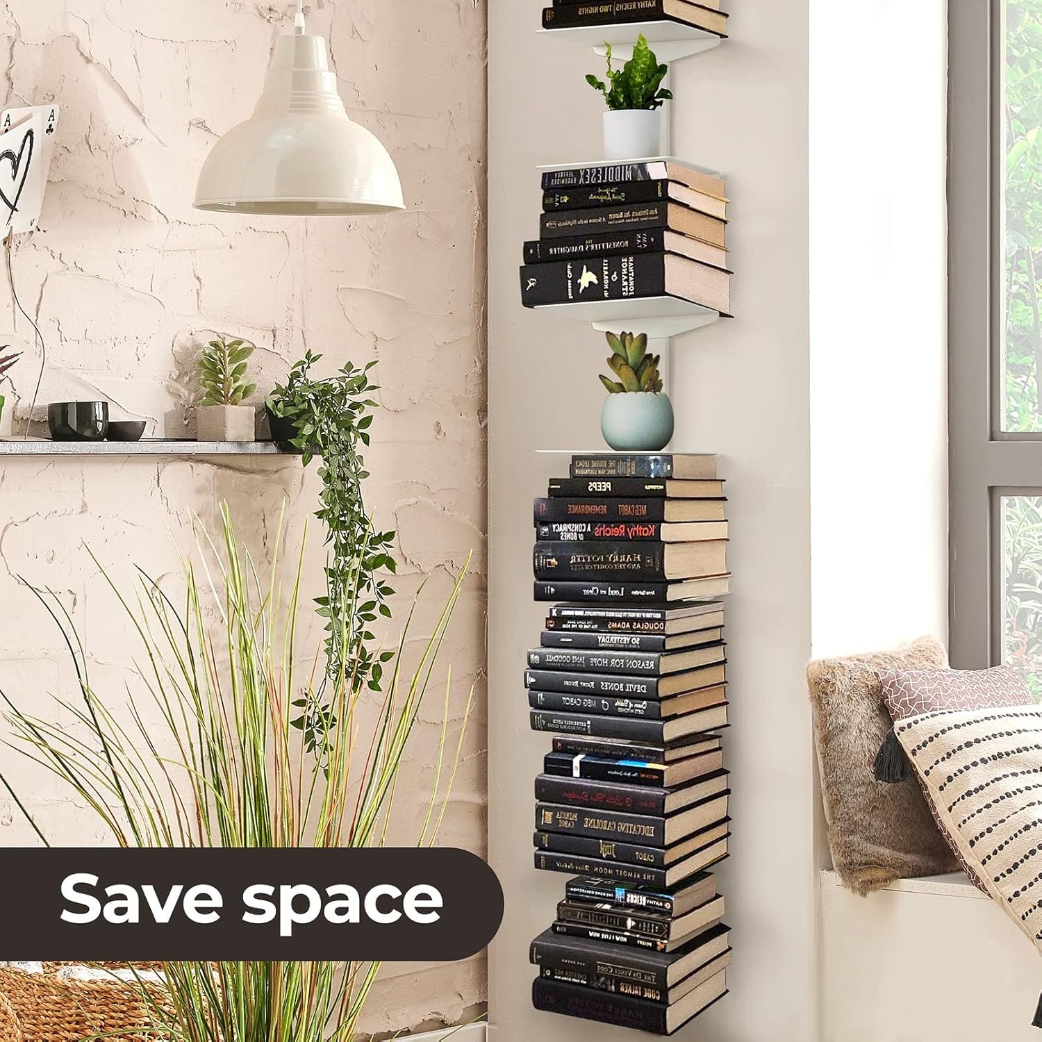 Floating Book Shelves for Wall, 8 Tier Invisible Floating Bookshelf, Vertical Spine Book Tower, Wall Mounted & Space Saving, Heavy Duty Metal Book Organizer for Home Office, 4 Pack White