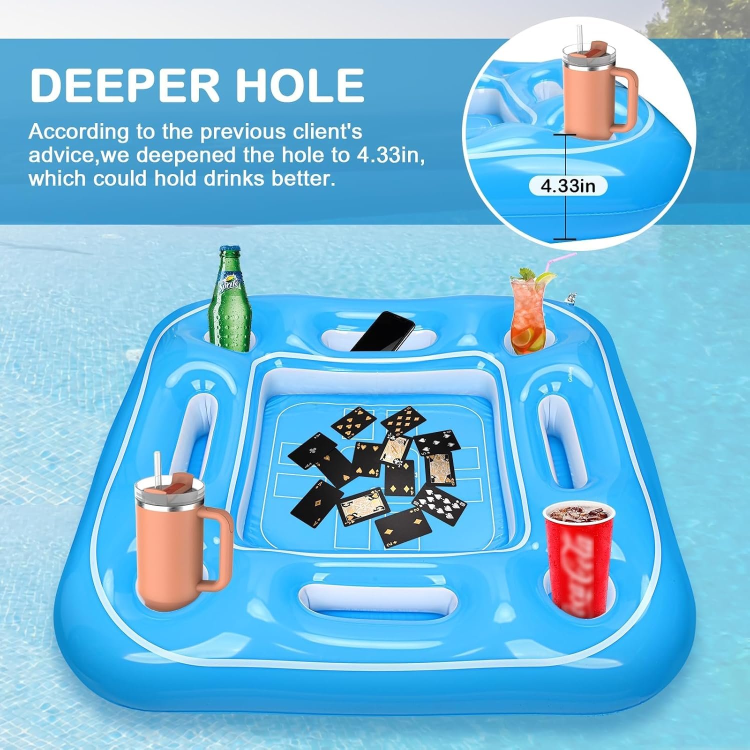 ✔️Say Goodbye to Spills-The 4 cup holders of floating card table for pool are deep and large to hold a variety of popular cups. Inflatable card table for pool has been upgraded to a diameter of 3.93 inches and a height of 4.33 inches. Even for Stanley Cup fits in the holder, you don’t need to worry about drinks tipping over. And 4 card holders is suitable for phones, iPad, or Bluetooth speaker.