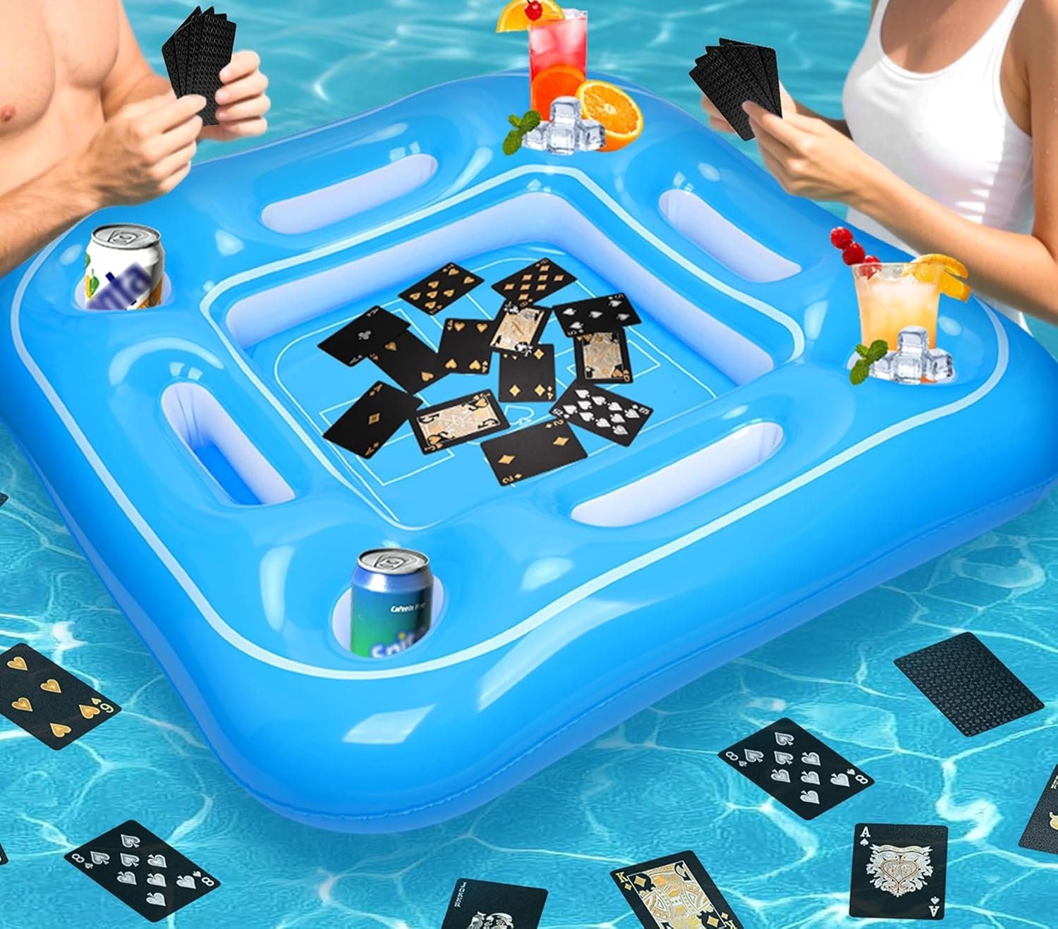 ✔️Ergonomic Edges Design -The floating card table for hot tub features tall inner walls on all four sides, helping to keep items securely in place and preventing water from splashing inside. Additionally, the edges of inflatable card table are thoughtfully designed with ergonomics in mind, making it comfortable to play. The inflatable floating card table is stable and sturdy enough to keep them within reach.