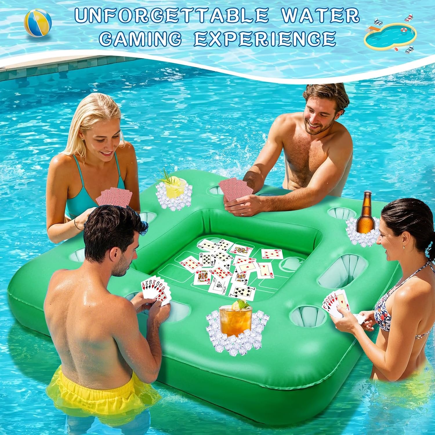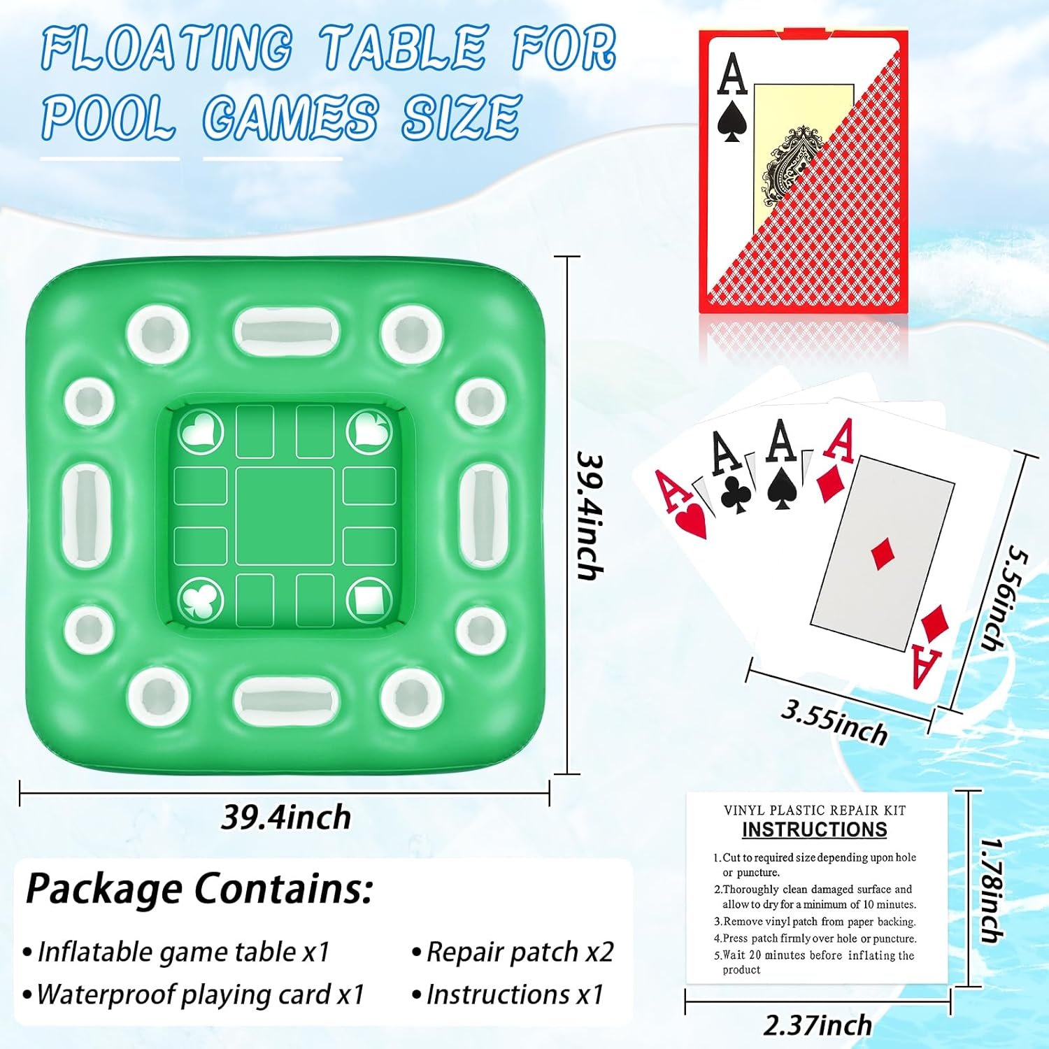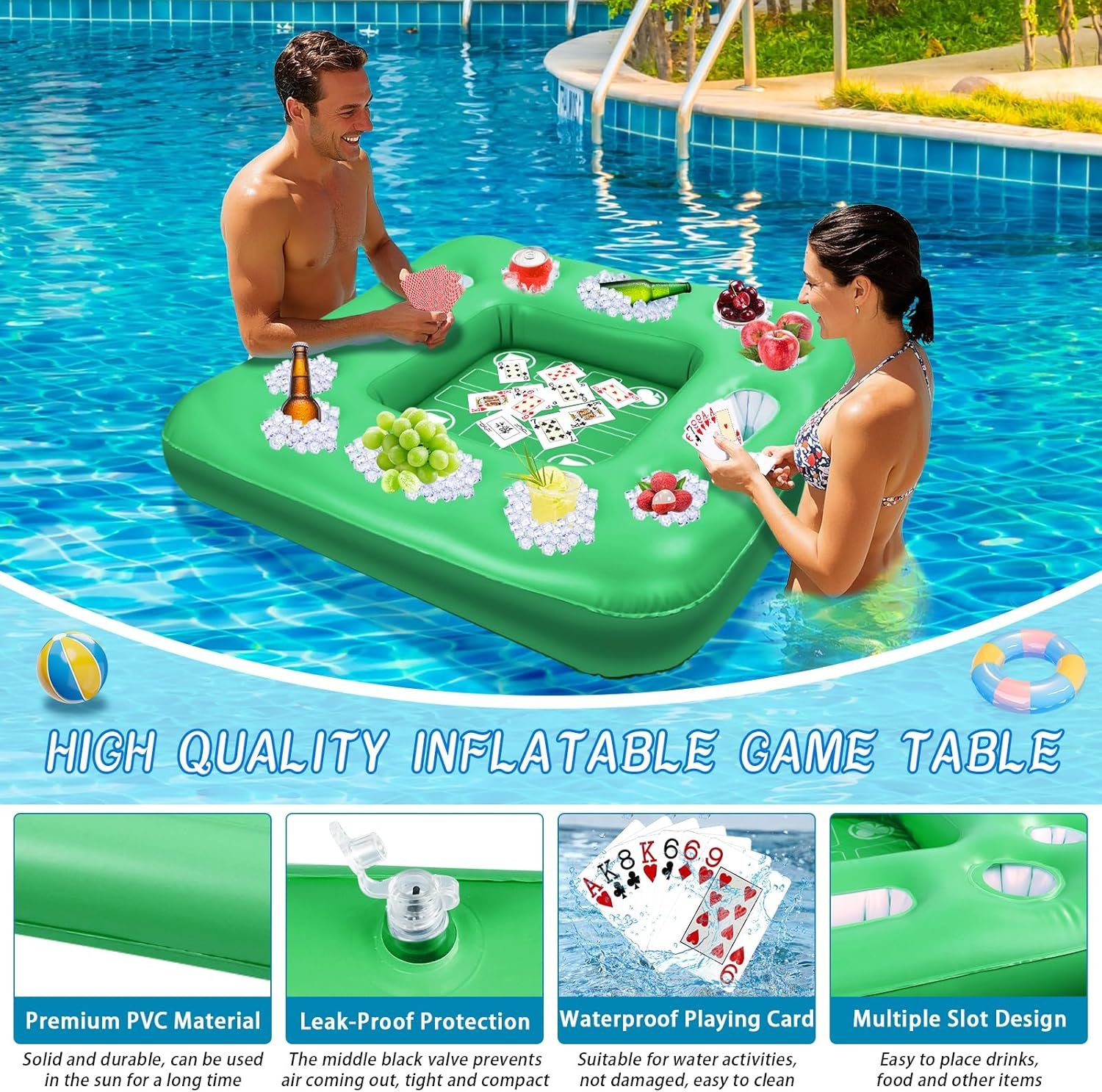 Large Floating Table for Pool: The floating pool table size is 40 inches x 40 inches, large enough for 4 people to play various card games together. The waterproof playing cards are designed for use in water, so you don’t have to worry about being damaged and enjoy your summer pool time to the fullest