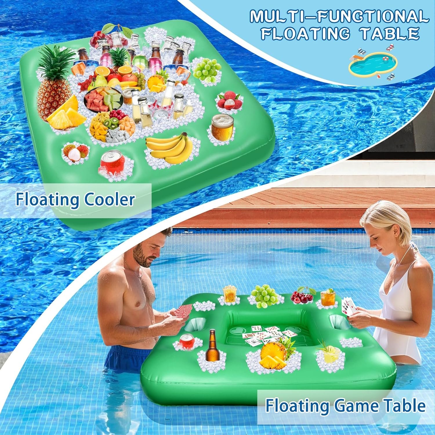 Multi-Functional Floating Pool Table: Designed with multiple cup holders and slots for wine glasses and phones. Not only can it be used as a floating pool games for adults, but you can also use it as a pool floating cooler. You can load ice cubes on the middle trays to chill drinks, food, and fruits, keeping them cool in hot summers.