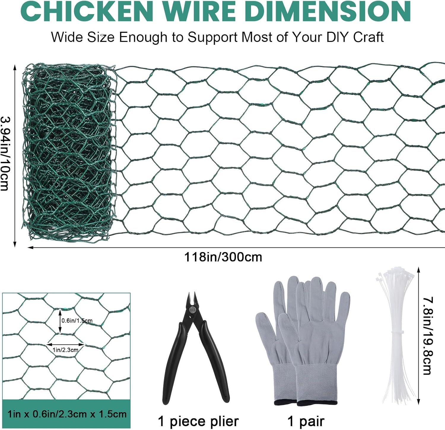 Floral Chicken Wire for Craft, 4 x 118” Hexagonal Galvanized PVC Coated Garden Netting Fence for Craft Poultry Garden with 1 Gloves 1 Wire Cutter 50 Pcs Cable Zip Ties Floral Chicken Mesh