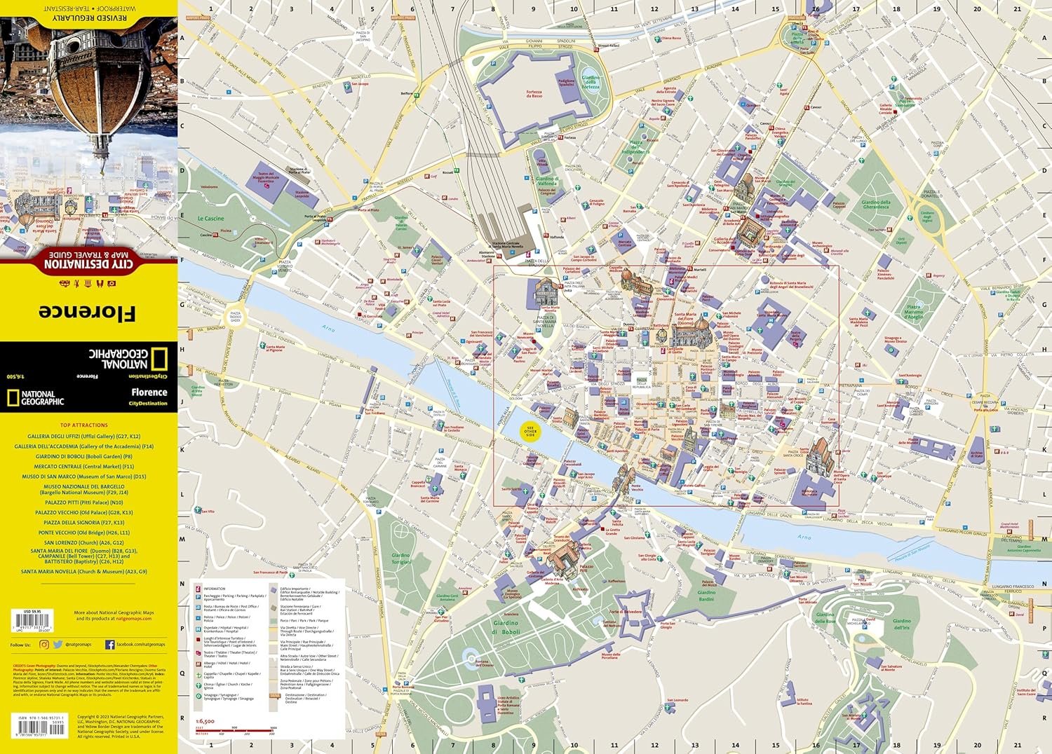 The reverse side has a regional map, showing the city’s location on the heart of Tuscany. An insert map of Centro Storico provides extra detail of the remarkable city center. A user-friendly index of streets, hotels and points of interest, will ensure you find your destination quickly. A travel guide gives background information about the city, its most popular destinations and an overview of the public transit system, including a diagram of Amerigo Vespucci airport. With such an abundance of specialized content that is not available in traditional maps, this destination map is the perfect complement to National Geographic’s Florence and Tuscany Traveler Guide.
