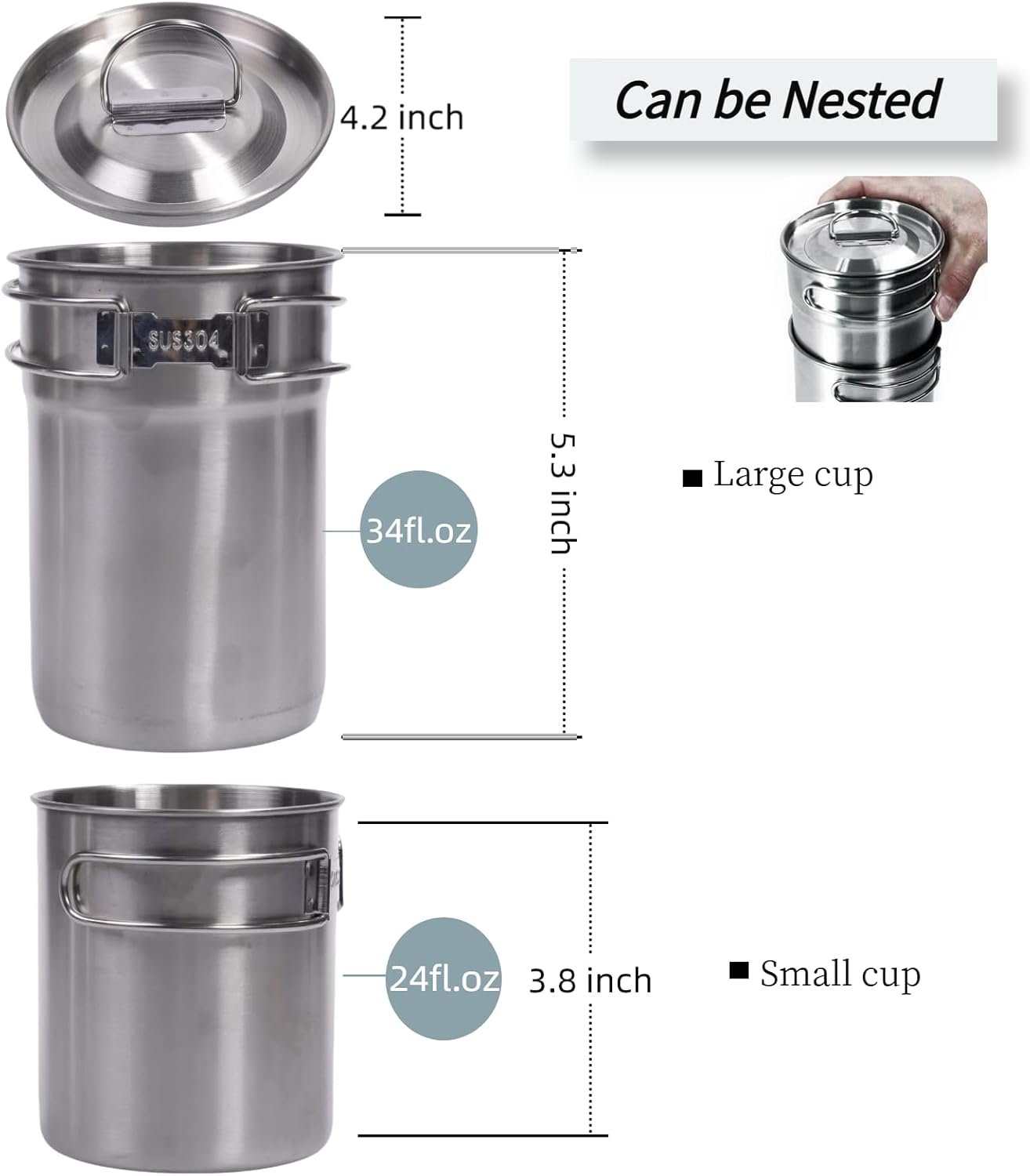 Lightweight and Durable:Stainless steel camping cookware features 418g weight ,Compared with other materials such as aluminum and titanium, the stainless steel material makes the Camping Coffee Mug cups more durable rust resistant but lighter on your bag