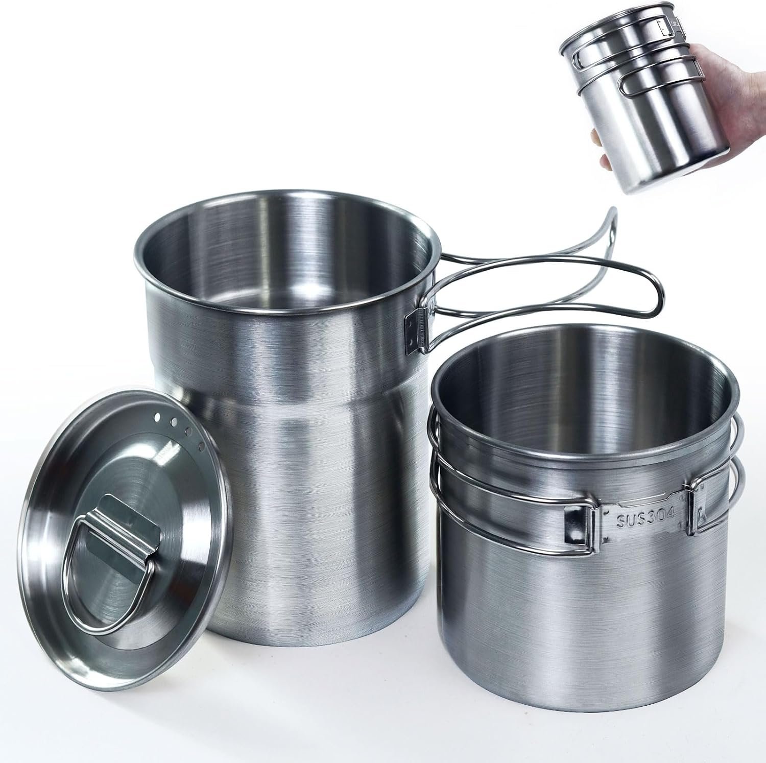 Foldable Camping Cups Mugs Camping Pot Cookware 304-Food-Grade Outdoor Camp Cooking Set with Vented lid,Stainless Steel Backpacking Cookware for Hunting