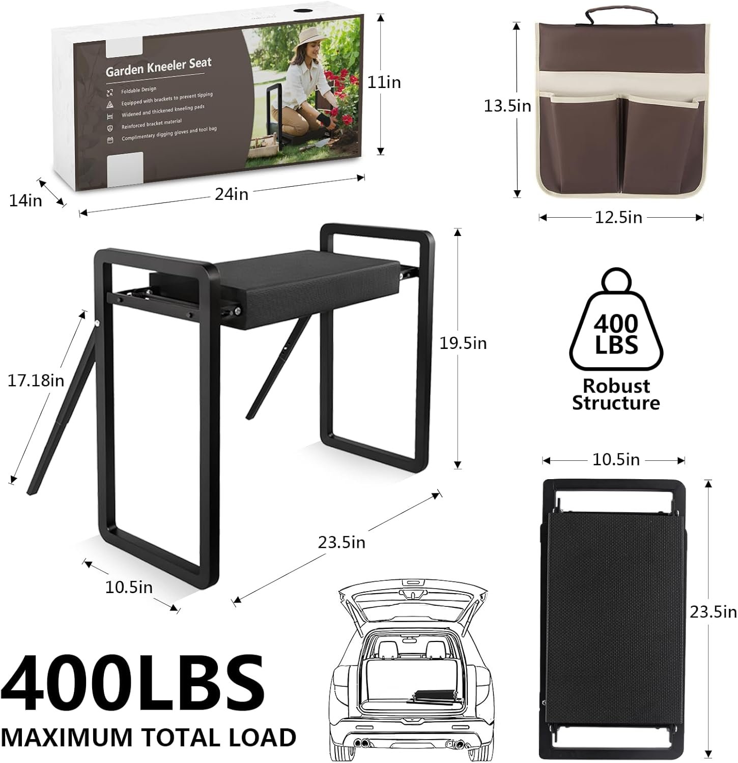 Foldable Garden Kneeler Seat Heavy Duty with Support Bracket [Upgraded Widened Thick 10” Kneeling Pad] Garden Stool with Large Garden Tool Bags with Pockets -Gardening Gifts for Parents