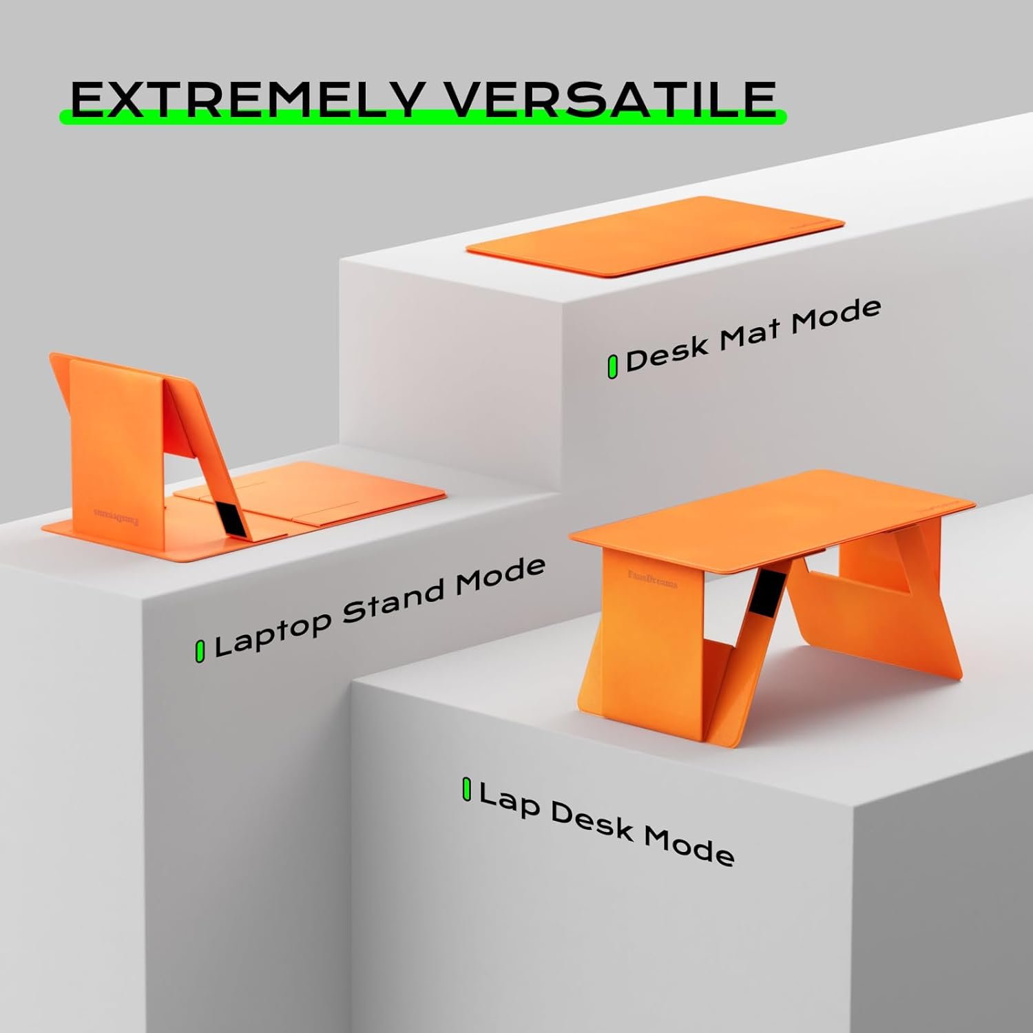 THREE FLEXIBLE MODES: Desk Mat Mode- smooth and heat-resistant. Laptop Stand Mode–elevates view, eases neck strain. Lap Desk Mode- perfect for bed, sofa, or car use. This portable and foldable laptop desk adapts to various settings, enhancing comfort and boosting productivity