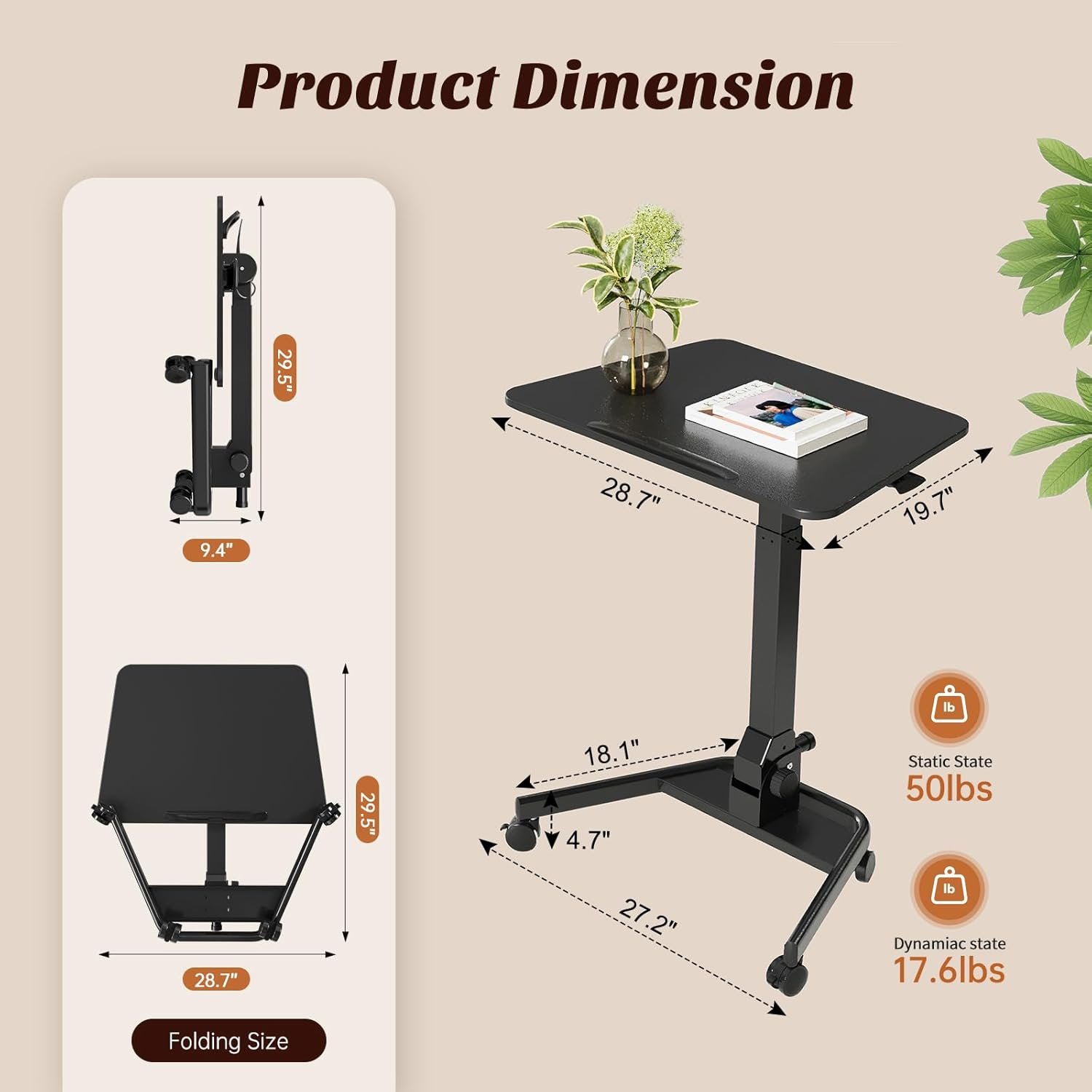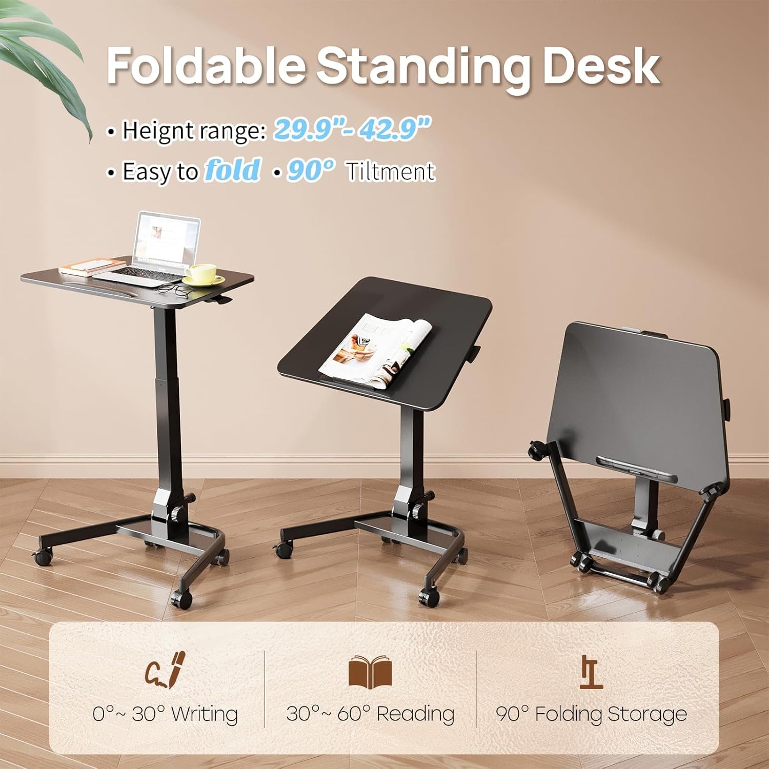 Foldable Mobile Standing Desk, Pneumatic Height Adjustable Rolling Sit Stand Desk, 90° Tiltable Portable Laptop Cart on Wheels, Mobile Desk Workstation for Home Office, Easy to Fold