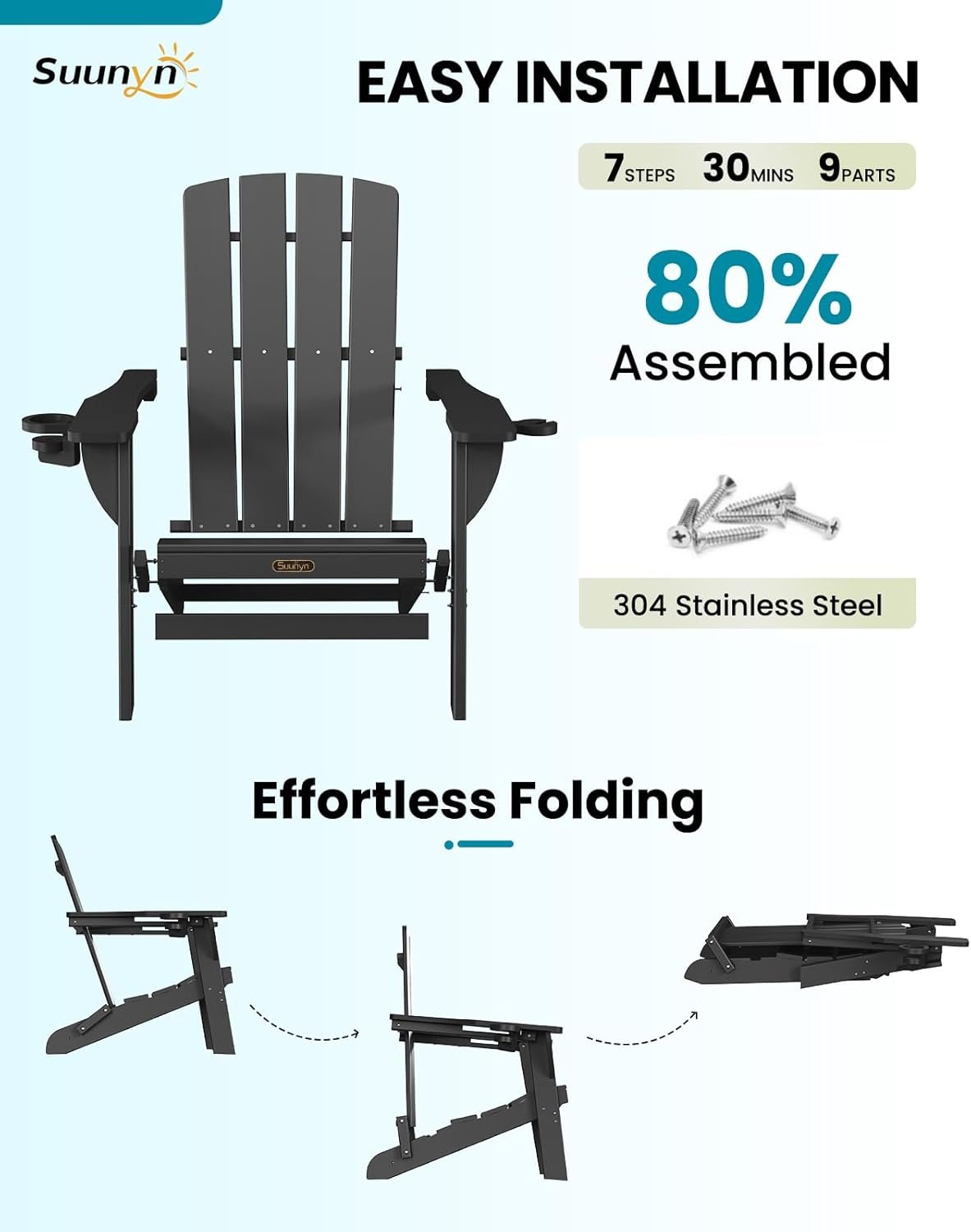 FOLDING DESIGN: Are you still struggling with the size of adirondack chairs? This SUUNYN adirondack chair boasts an even smaller footprint and more convenient folding design for easy storage. Buy SUUNYN folding adirondack chairs to maximize space in your home