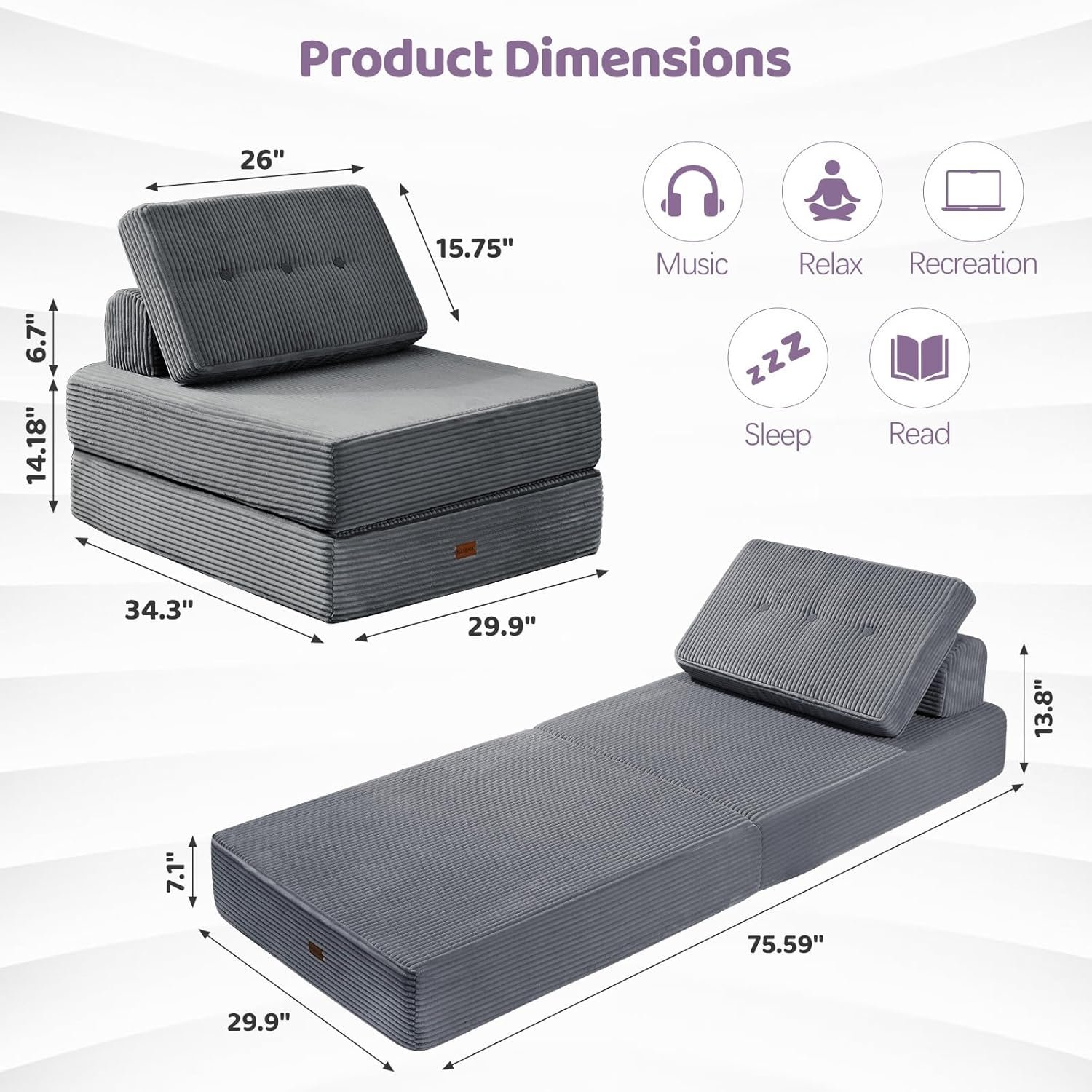 Multiple Combinations and Easy Conversion: This portable lazy sofa floor chair comes in a basic 3 different configurations, no assembly required, pull it out and use it. You can use it as a floor sofa chair while reading or stretch it out into a mattress to provide rest. House guests can turn it into a collapsible lazy sofa bed in seconds for additional sleeping space. It is easy to fold, carry and store to meet different needs in your leisure, work and other life.