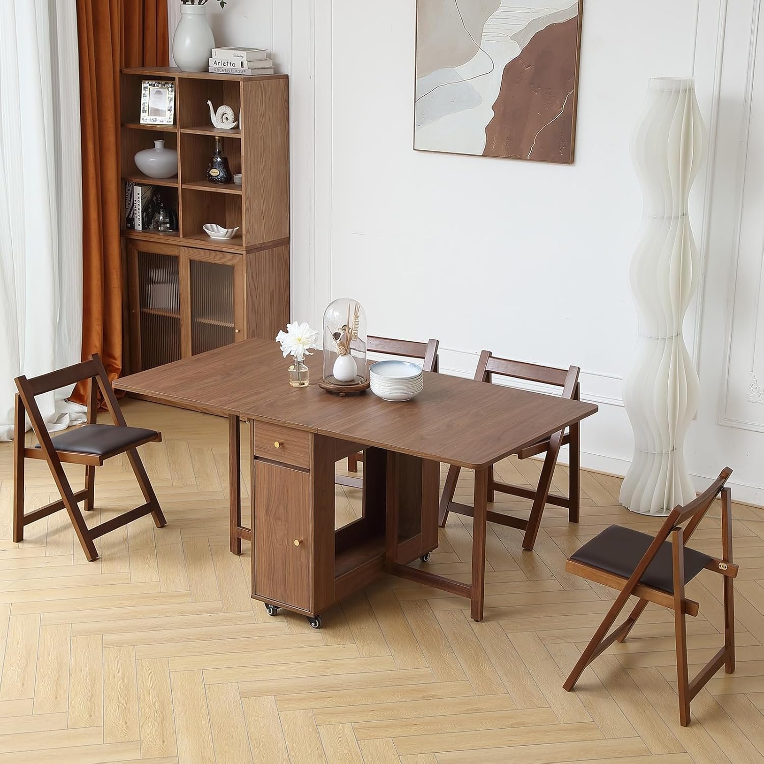 The dining chairs set of 2 and the folding dining table with its storage cabinet can store four chairs. This brillant combination is a great space saver.