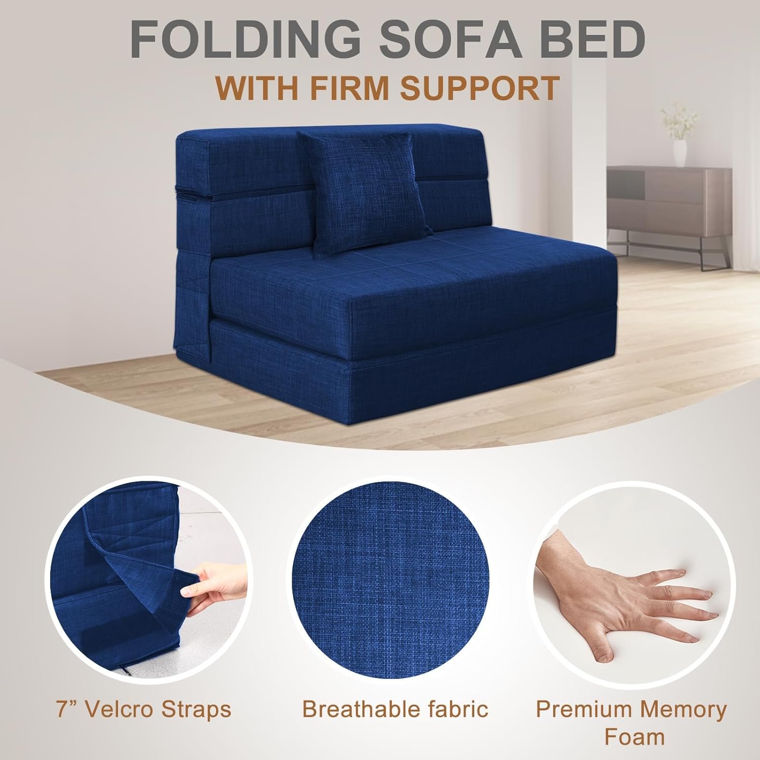 Folding Sofa Bed Couch Memory Foam with Pillow Sleeper Chair Lazy Couch Twin Size Futon Convertible Guest Beds,Washable Cover,Dark Blue