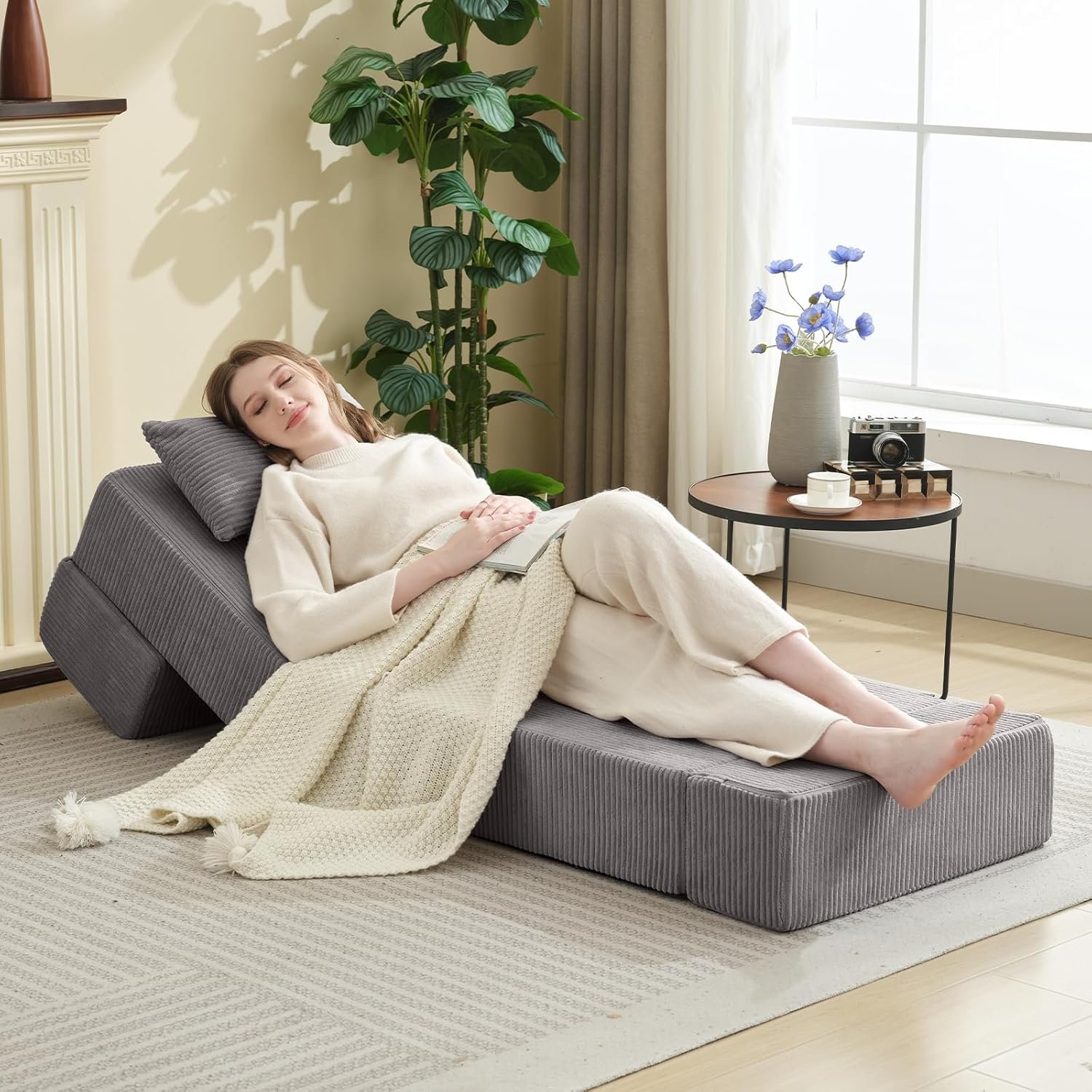 HEAD and LUMBAR PILLOWS: The multifunctional fold out bed is scientifically ergonomically designed with head and lumbar pillow sets designed to provide superior comfort and support, providing a luxurious experience whether you are sitting or lying down. The folding sofa bed measures approximately 25.3 inches x 78 inches and provides a comfortable chair or floor couch.