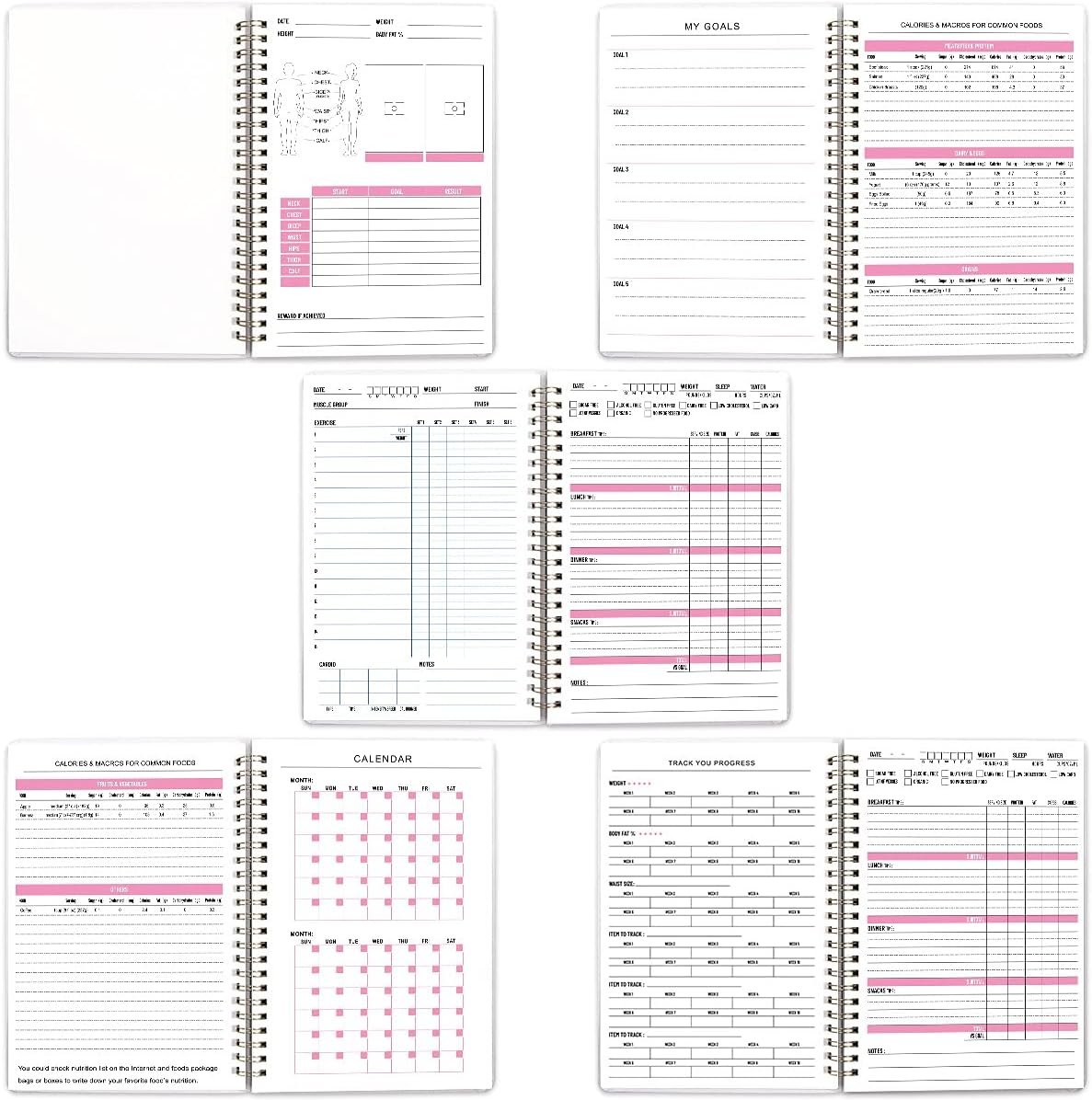 1 measure page, 1 goals page, 2 calories for foods pages,1 calendar page, 1 progress page, 61 food pages, 61 workout pages, this food journal fitness journal has all you need to track your food and has diagrams of different exercises that you can do to target different parts of your body