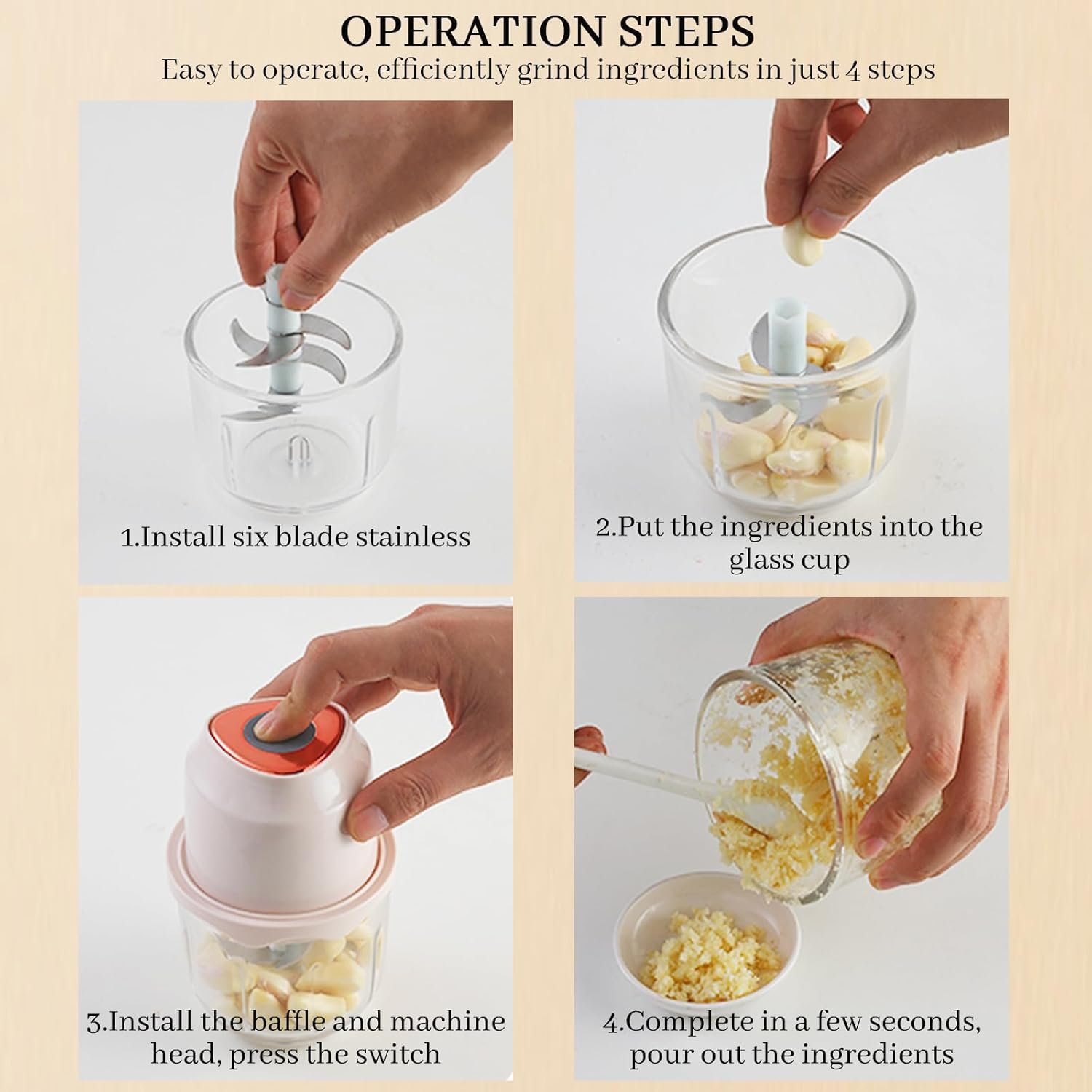 Easy to Clean: The main head, food isolation cover, stainless steel six blade knife, and heat-resistant glass bowl of the mini food processor are detachable and can be easily cleaned in tap water. The garlic puree dispenser only needs simple cleaning and assembly after each use, and can be dried and stored for future use