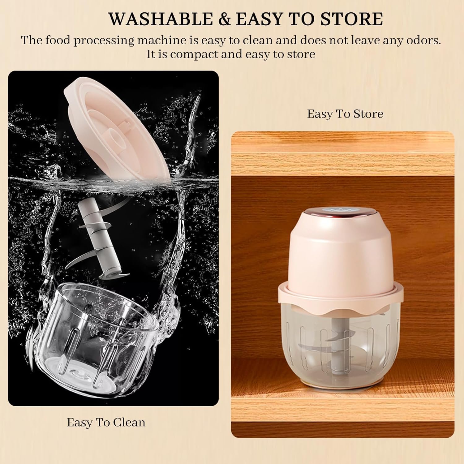 This vegetable chopper adopts a separate design, and can be disassembled and cleaned except for the motor which cannot be washed with water. The cooking bowl is made of heat-resistant glass cups, which are very easy to clean and will not leave any residual odorTip: The blade is very sharp, be careful not to cut your hands when cleaning Easy to Store Compact and Easy to Store Model