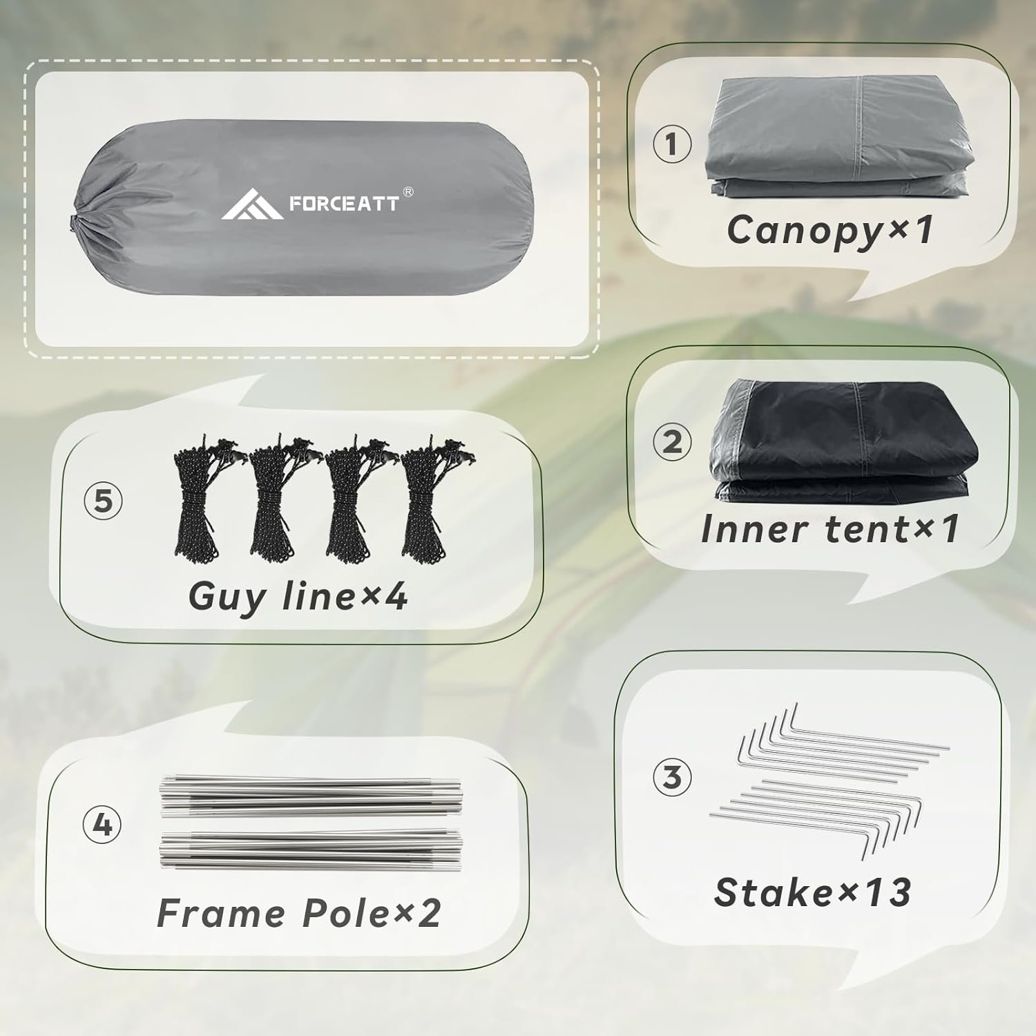 【LIGHTWEIGHT AND CONVENIENT】 The internal size of the Forceatt camping tent is 86.6×51.1×43.3in (220x130x110cm), which can accommodate two person at the same time. At the same time, it has a package size of 41 x 14cm and weighs 5.68lb (2.58kg), which saves space and is easy to carry.