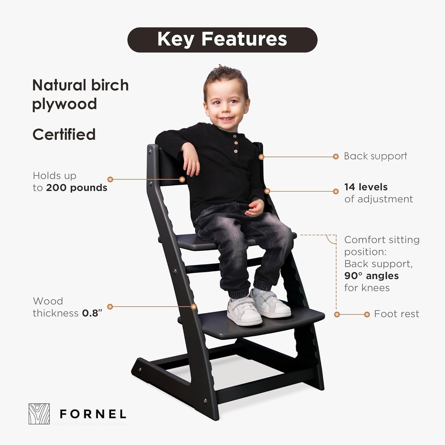 FORNEL Modern Black Wooden High Chair | The Adjustable Grow-with-Me Chair, A Sleek Alternative to Stokke | Perfect for Minimalist & Industrial Kitchens